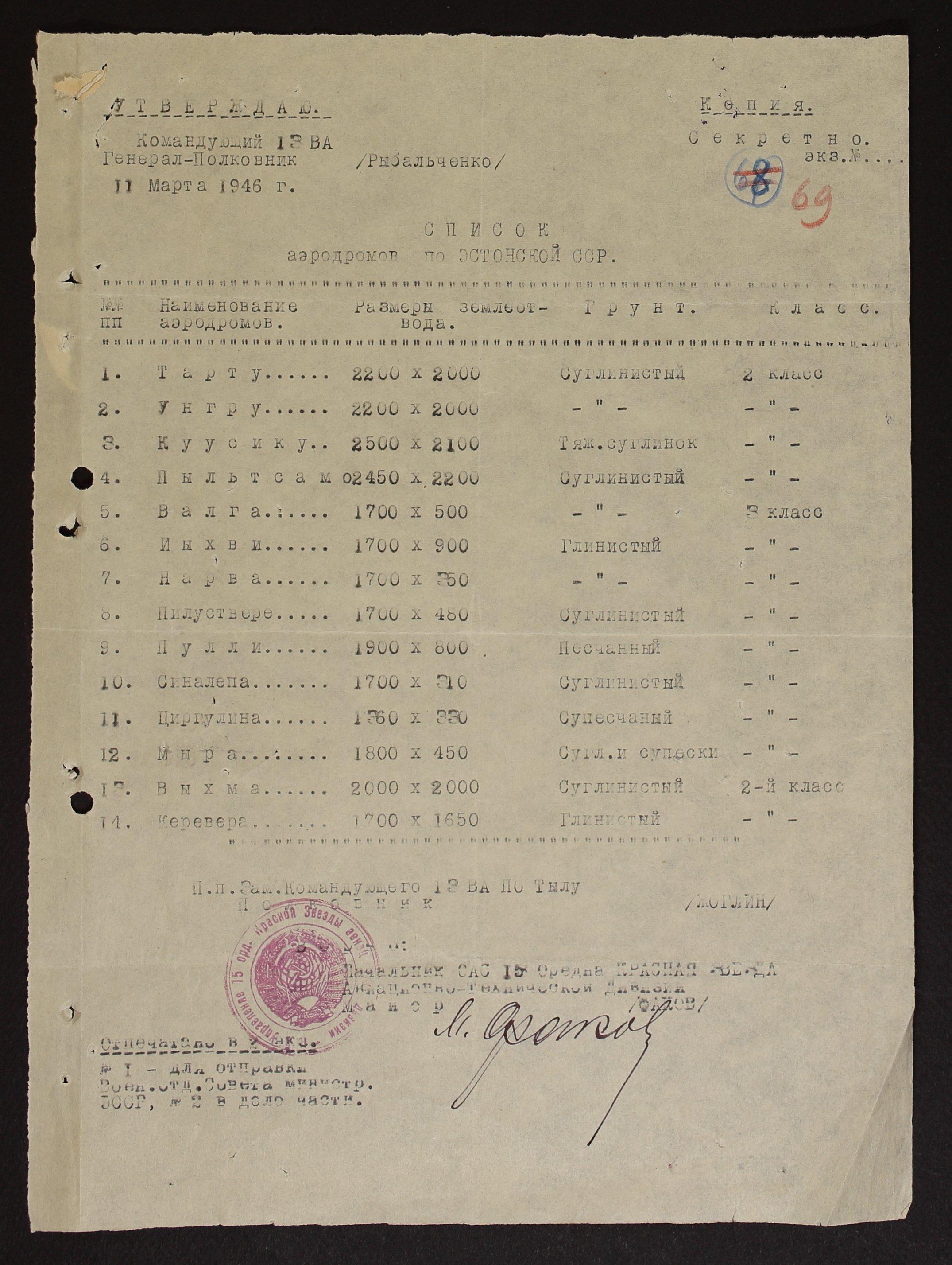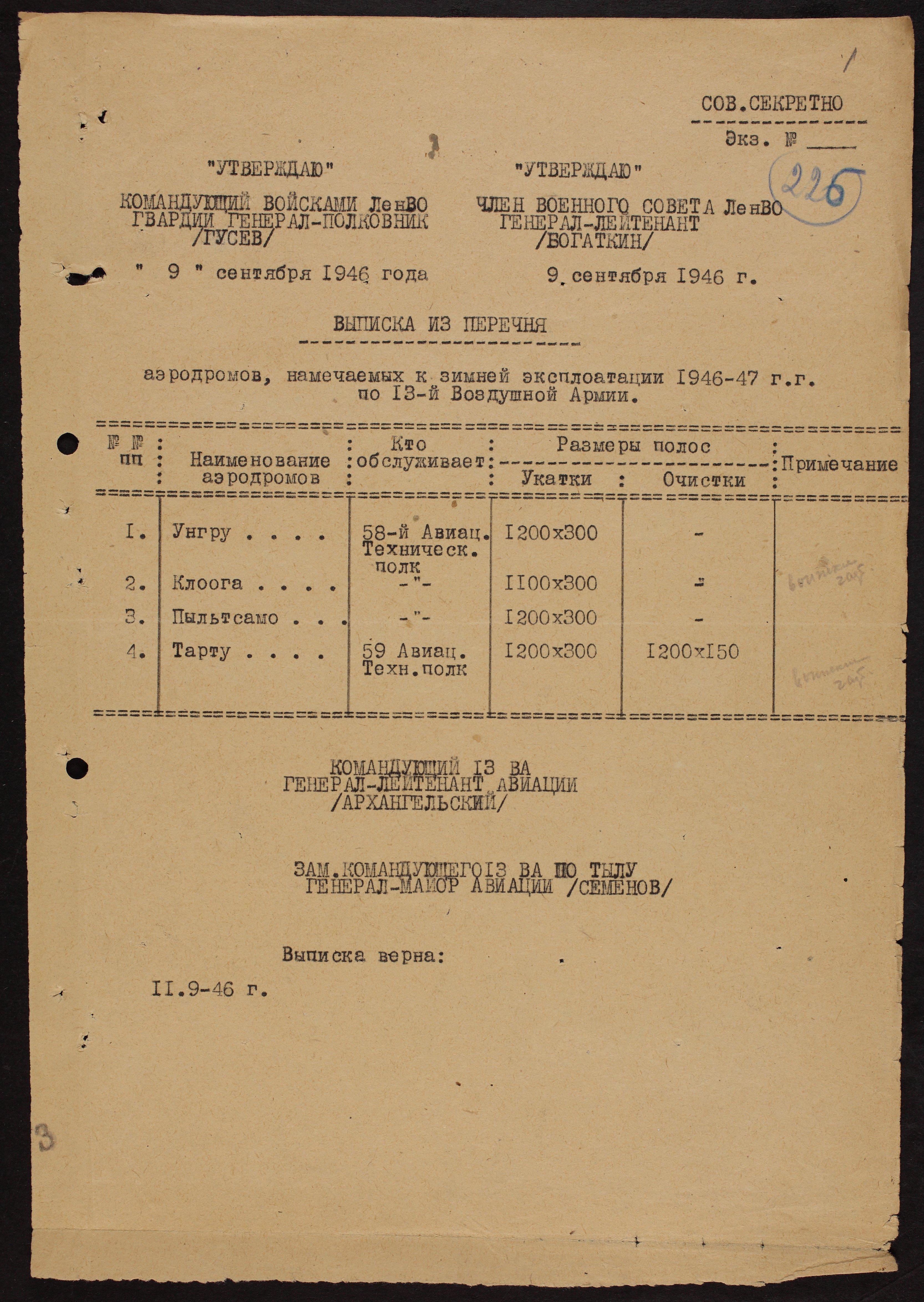 13. õhuarmee saadetud nimekiri sõja ajal (s.o. siis 1944-45) kasutatud lennuväljadest, milledest 1945 loobuti ning maa tagastati.