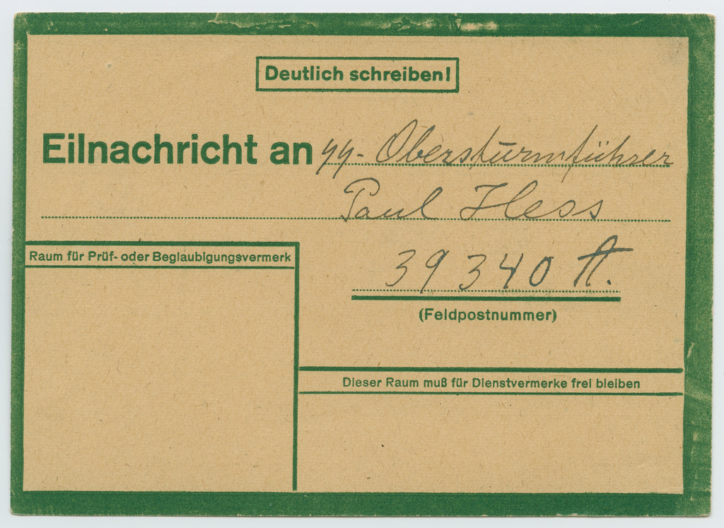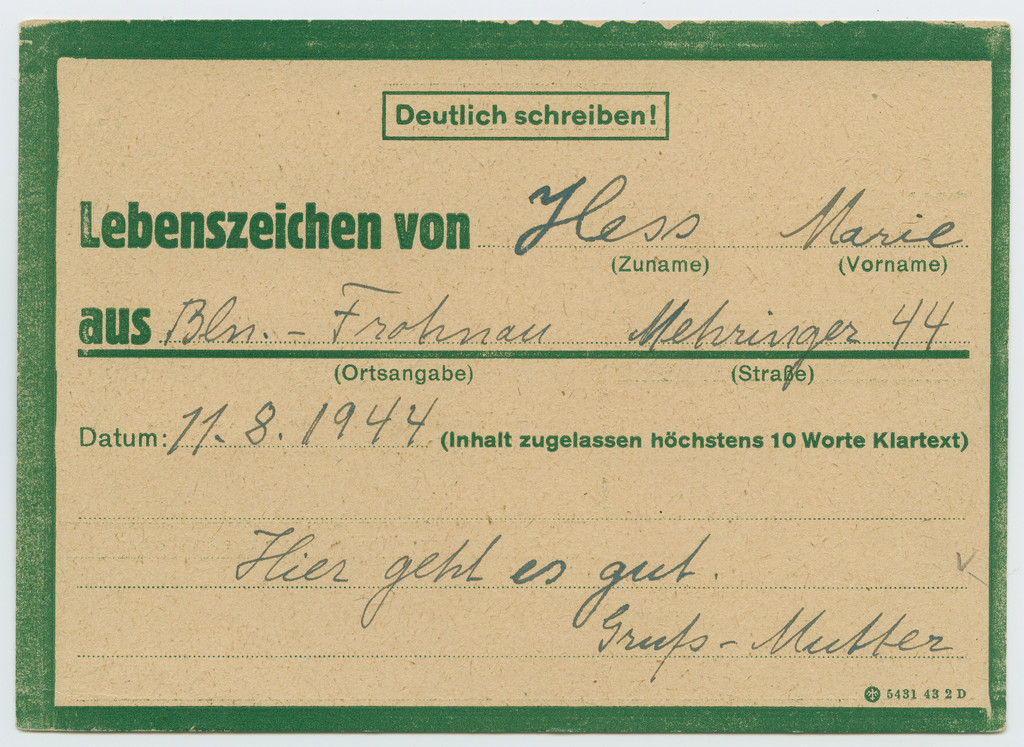 Eilnachricht oli spetsiaalne kaart millega sai saata kuni 10 sõna pikkuse "elu märgi" sõnumi. Tsiviilisikutele oli punane kaart ja relvajõududele roheline. Eesti kontekstis pole ma selliseid kaarte näinud, kuigi Euroopa kontekstis on need suhteliselt levinud. Ema kirjutab Saksamaalt pojale, et neil on kõik korras.