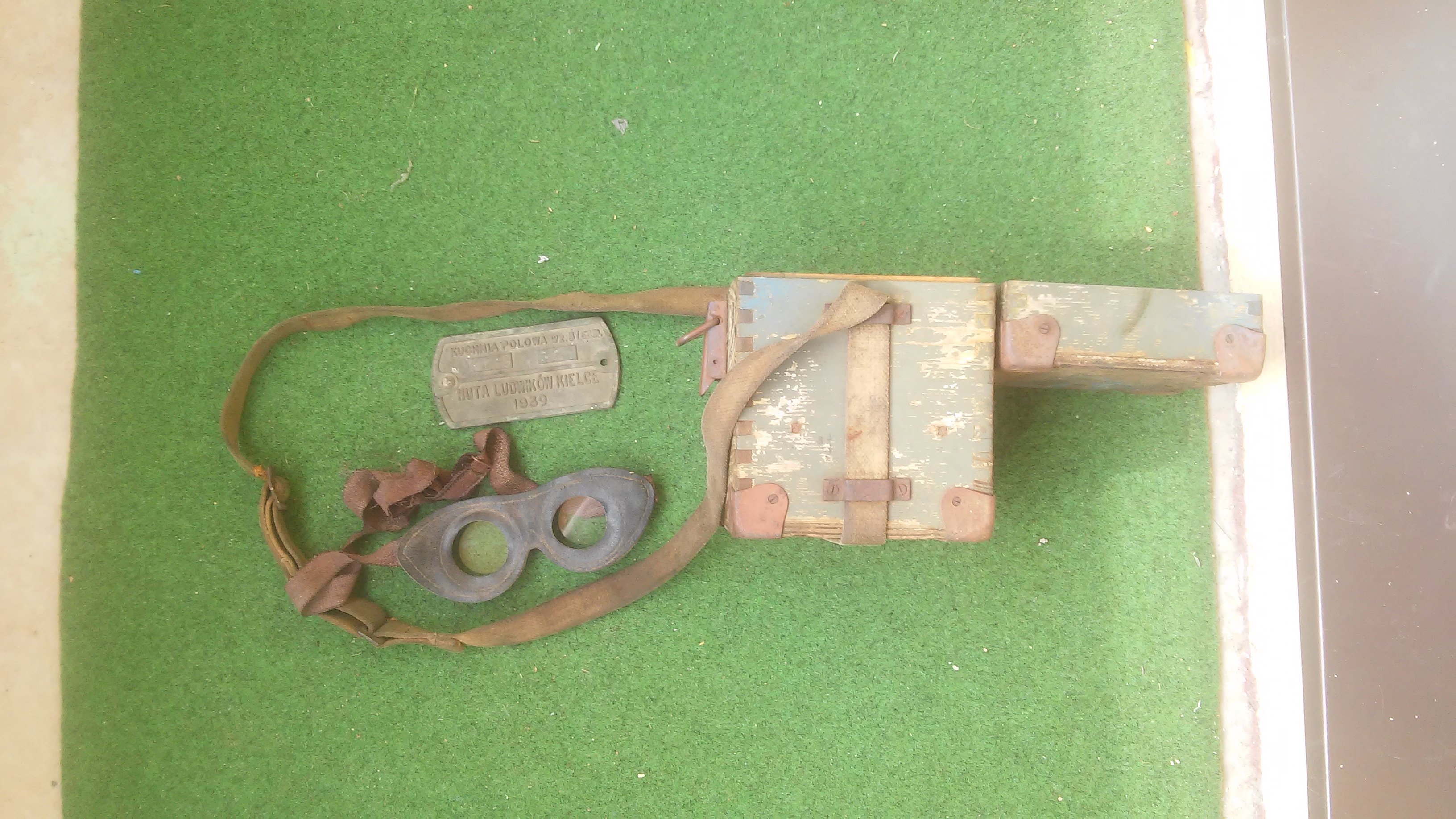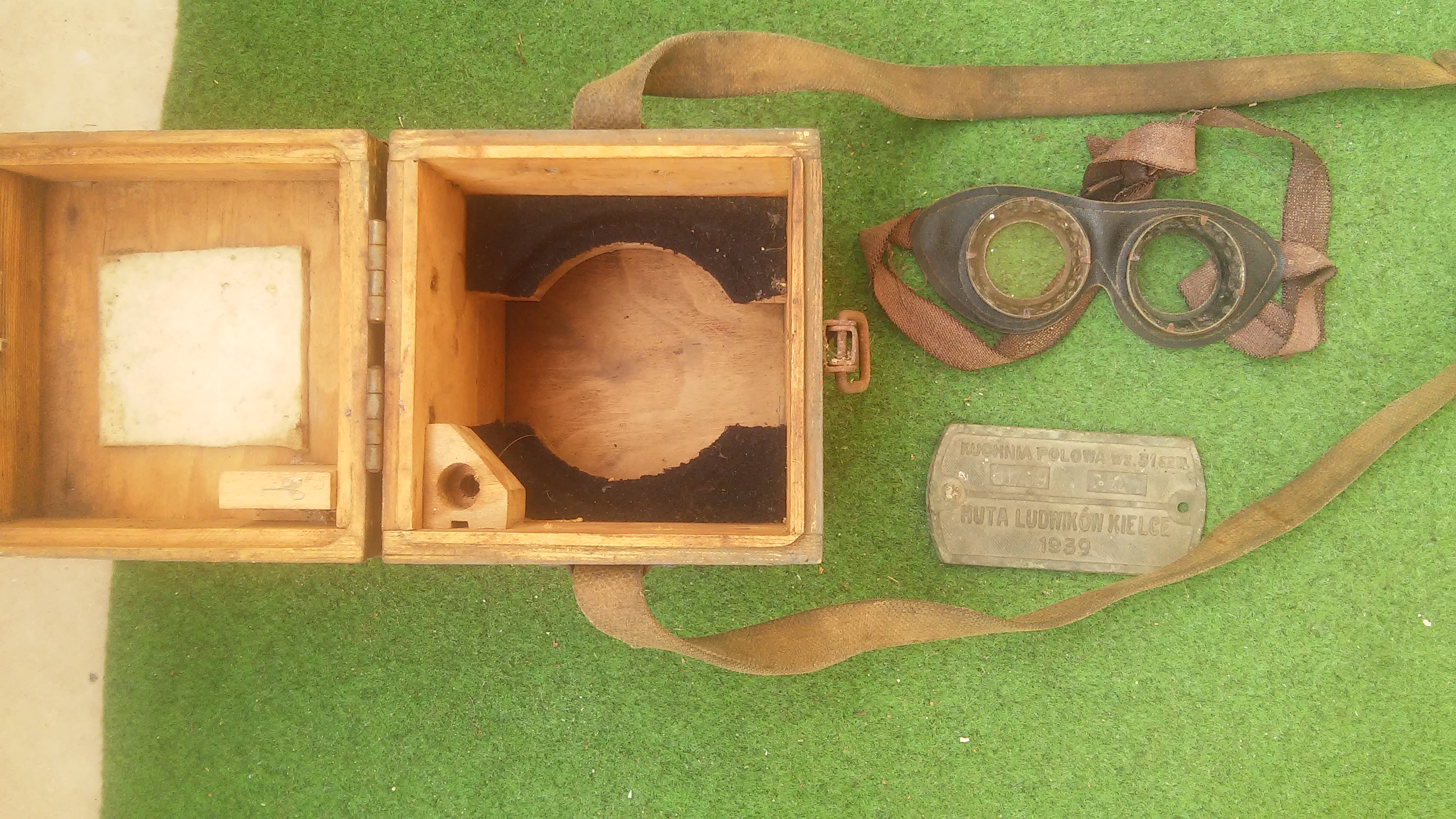 Puust rihmaga kast on vene toodang ja mõeldud optikale.Prillid on saksa mootoratturi varustusest.