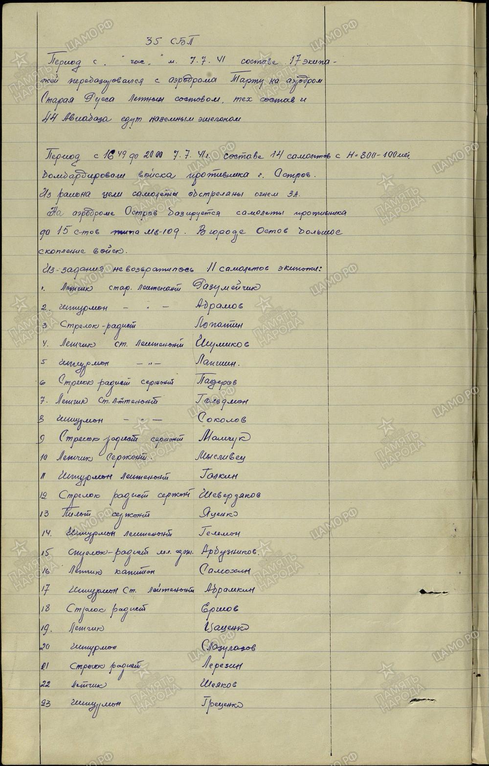 Täielikku õnne sündmuste kokkusobitamisel segab aga 35. sbap rünnak Ostrovile 7. juuli päeval, see ei taha päevikutekstiga kokku minna:
