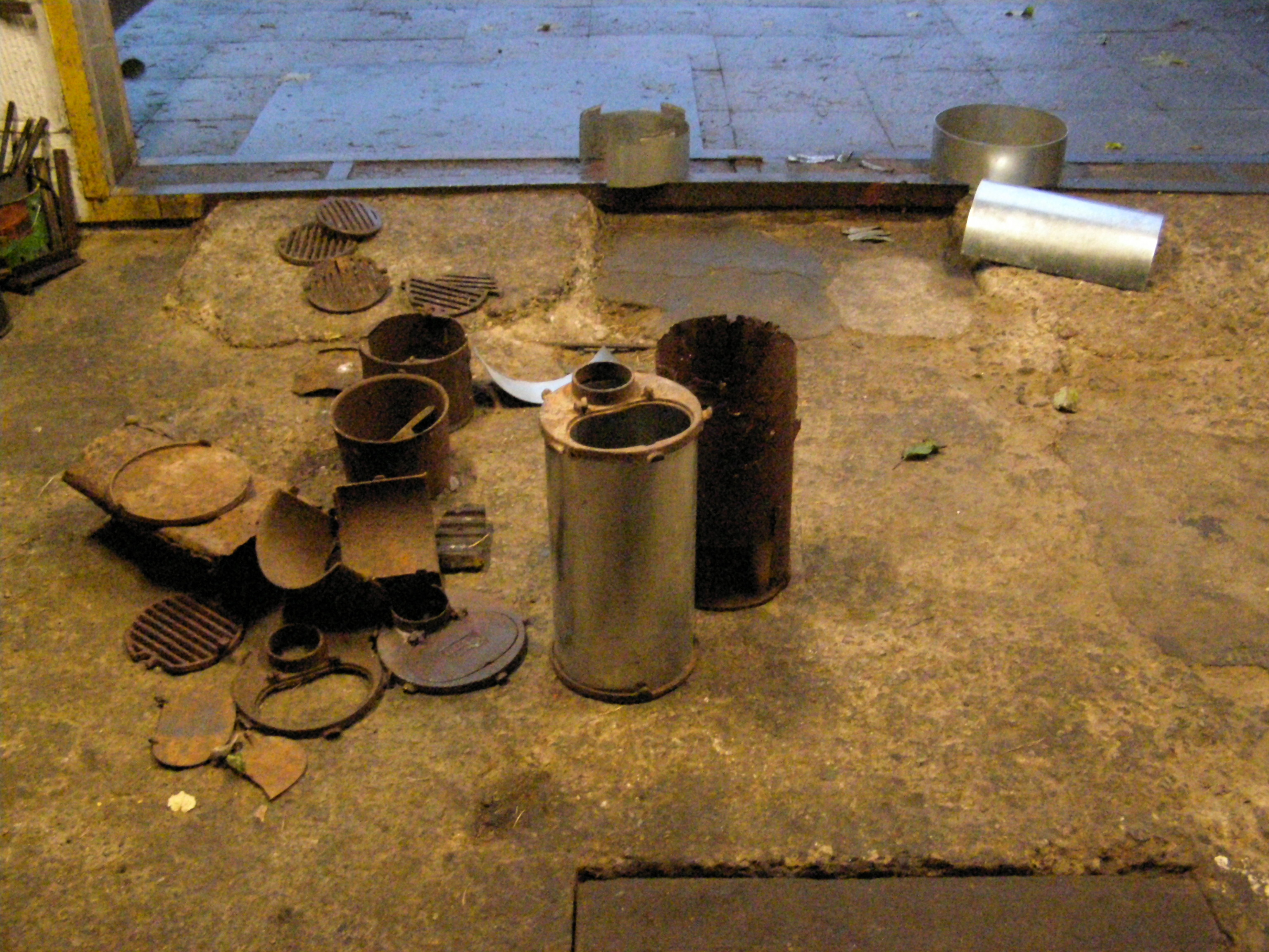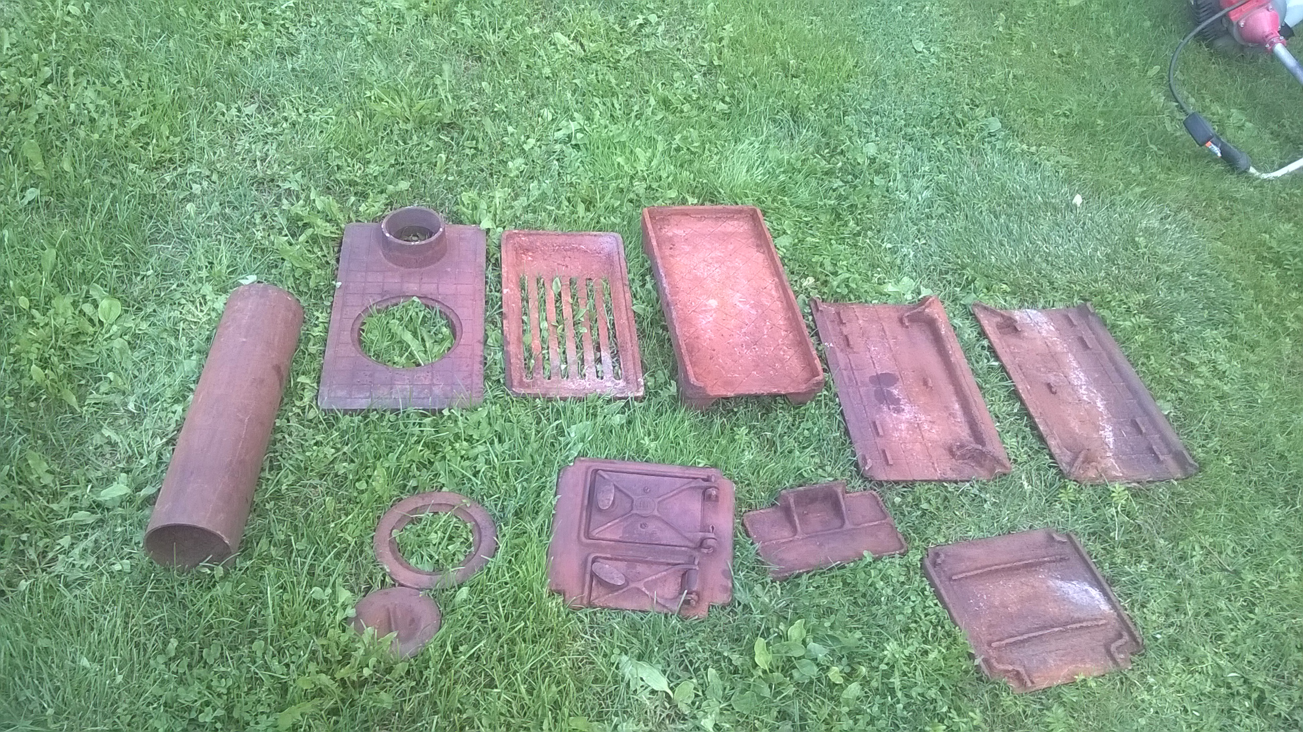 Hetkel peaaegu kolme pliidi jagu malmi kogunenud ja tundub, et eri tootjatel mõõdud natuke erinevad ja eks roostetamine on oma töö teinud. Kahe originaal kesta jäänuste järgi kõrgus mõlemal 40 cm aga alumise õhuvõtu ava mõõdud hoopis erinevad. Kesta diameeter tuleb erinev olenevalt mis mõõdus otsad on. Seal teema alguses viidatud vene foorumis on kesta plekk keeruliselt valtsimisega kokku liidetud (muide seal teema vahepeal edasi arenenud) aga nendel originaalidel, mis mul siin on jookseb pleki serv lihtsalt paari cm jagu teisele servale peale ja kinni punktitud.