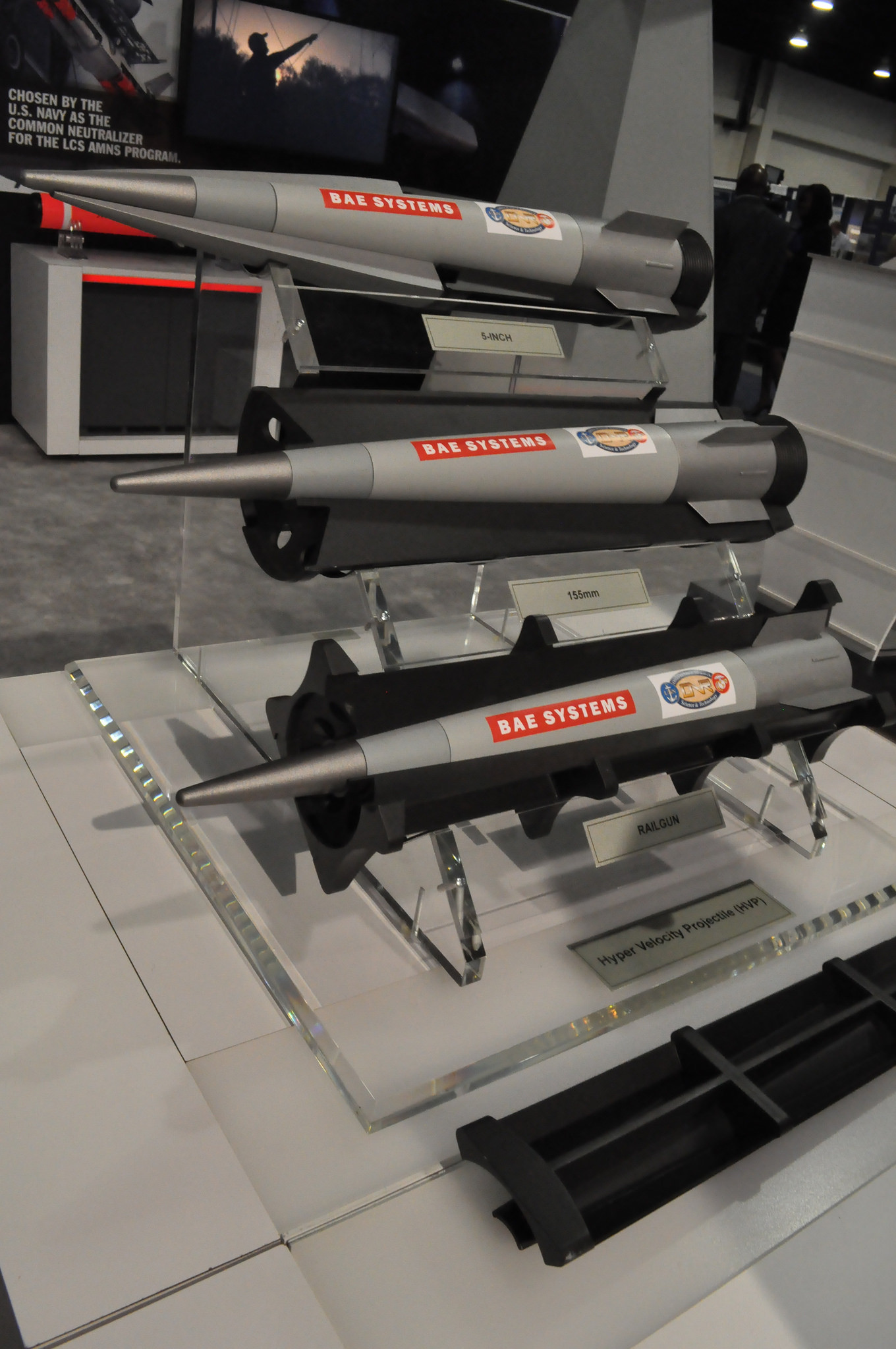 Sellel pildil, kus kolm projektiili stendil, kõige alumine on relsskahuri oma, konteiner alumiiniumist ja poolümarad kontaktpinnad voolurellsidele. Keskmine on sama moon AGS kahurile sobivas konteineris. Seda moona nimetatakse Multi-Mission HVP, maakeeles vist mitmeotstarbeline ülikiire projektiil ? :dont_know: