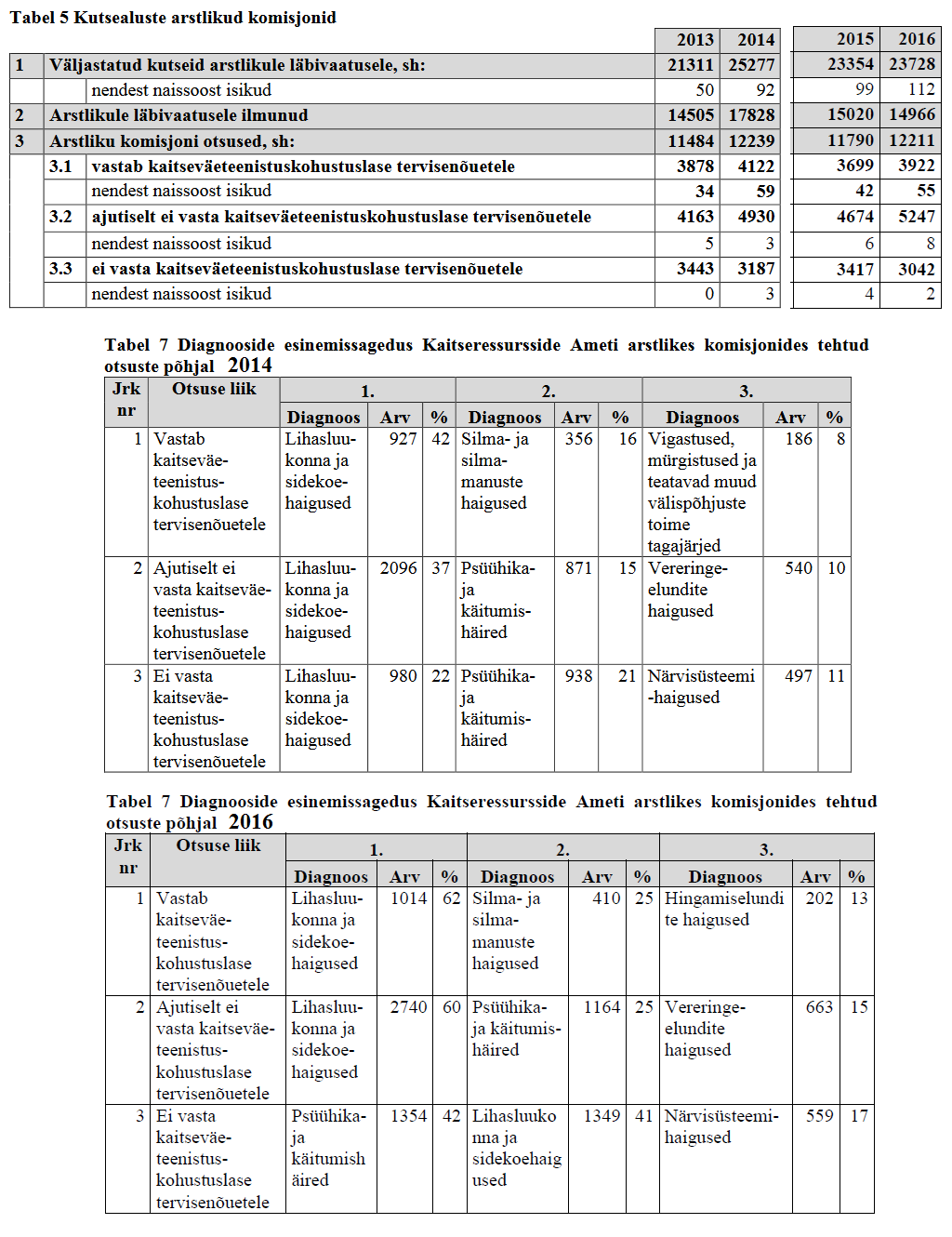 Terviseseisund arstliku komisjoni otsusel ei vasta kaitseväeteenistuskohustuslase tervisenõuetele: 2015a = 8896 ; 2016a = 11450 neist Kaitseväeteenistuskohustuslase tervisenõuetele ajutise mittevastavuse tõttu 2015a = 2975 ; 2016a = 3360