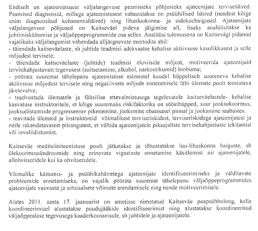 ....terapeudile kurtsin paari väiksema nahahaiguse kohta ja ta soovitas mul nendest hiljem rääkida komisjoni esimehega. Komisjoni esimees aga vaatas kolme eriarsti otsust, tegi kindlaks, et ka kõigi analüüside tulemused on normis, ning vormistas lõppotsuse, ise minu tervise vastu huvi tundmata. Mulle enne arstide juurde minekut antud terviseküsitluses kirjutatut ei käsitlenud suusõnaliselt ükski arst; psühhiaater ei heitnud küsitlusele pilkugi. Reaalsete terviseprobleemide tuvastamise võimalus on nii pinnapealse metoodika tingimustes vähetõenäoline. Tõenäoliselt on komisjoni liikmete tähelepanu juhtimiseks terviseprobleemidele tegelikkuses efektiivne vaid komisjonivälise eriarsti varasem selge diagnoos - formaalne diskursus, mida nad on kohustatud mõistma.