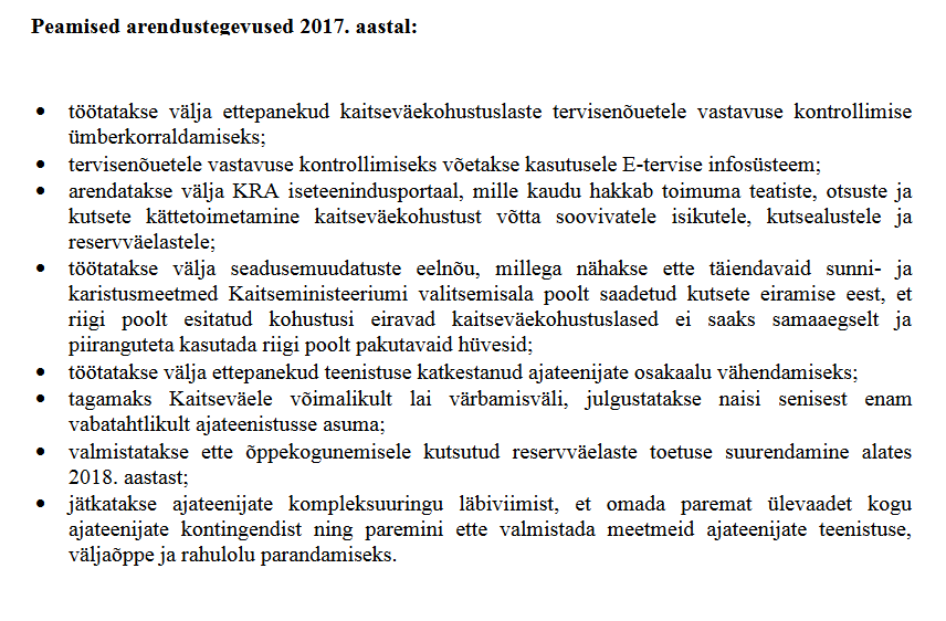 Selleks on KRA vähendanud alates 2009. aasta teisest poolaastast arstlikesse komisjonidesse kutsutavate kutsealuste arvusid ja teinud kaitseministeeriumile ettepaneku tervisekaardi vormi muuta nii, et edaspidi oleks arstlikul komisjonil võimalik teha põhjalikumaid sissekandeid.