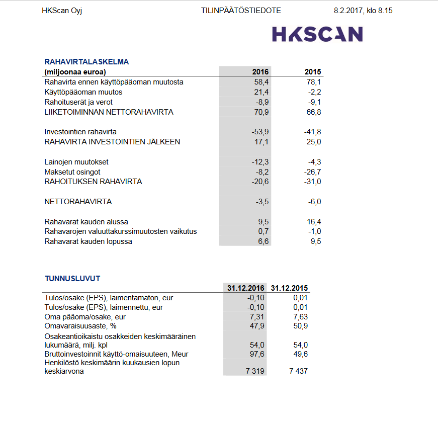 2017 "HKScan hinnagul jäävad möödunud 2016 aasta kasuminumbrid 12 kuni 14 miljoni euro vahele. Samas 2015. aastal oli ettevõtte kasum 21,5 miljonit eurot."