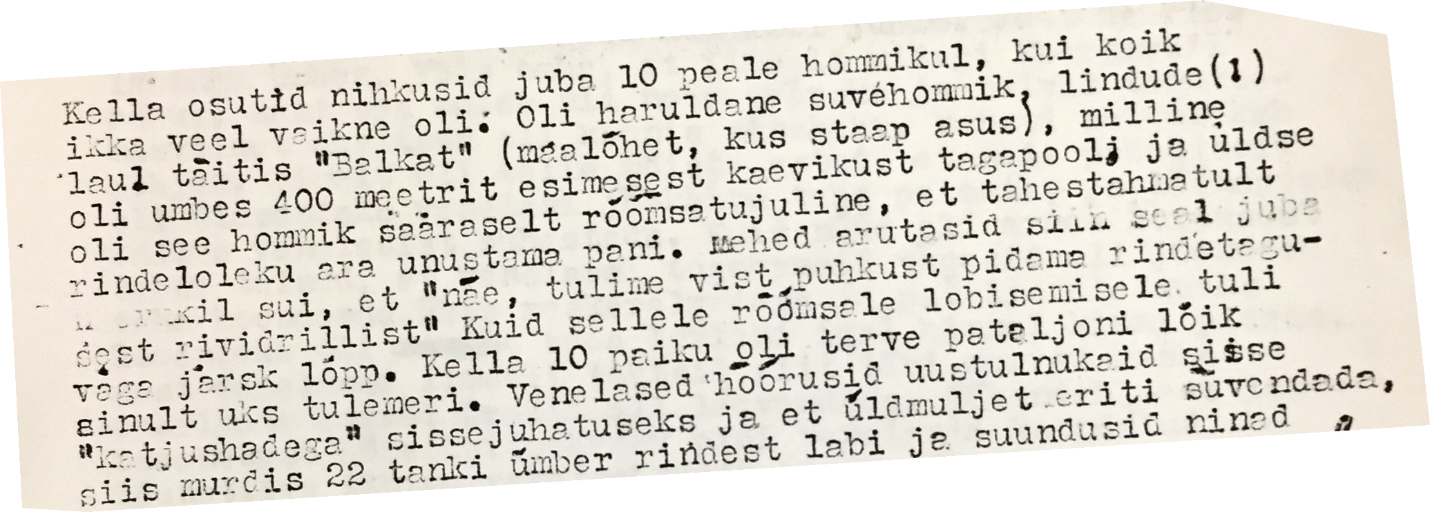 Lauses "Oli haruldane suvehommik, lindude (!) laul täitis "Balkat" (maalõhet, kus staap asus), milline oli umbes 400 meetrit esimesest kaevikust tagapool ja üldse oli see hommik....."