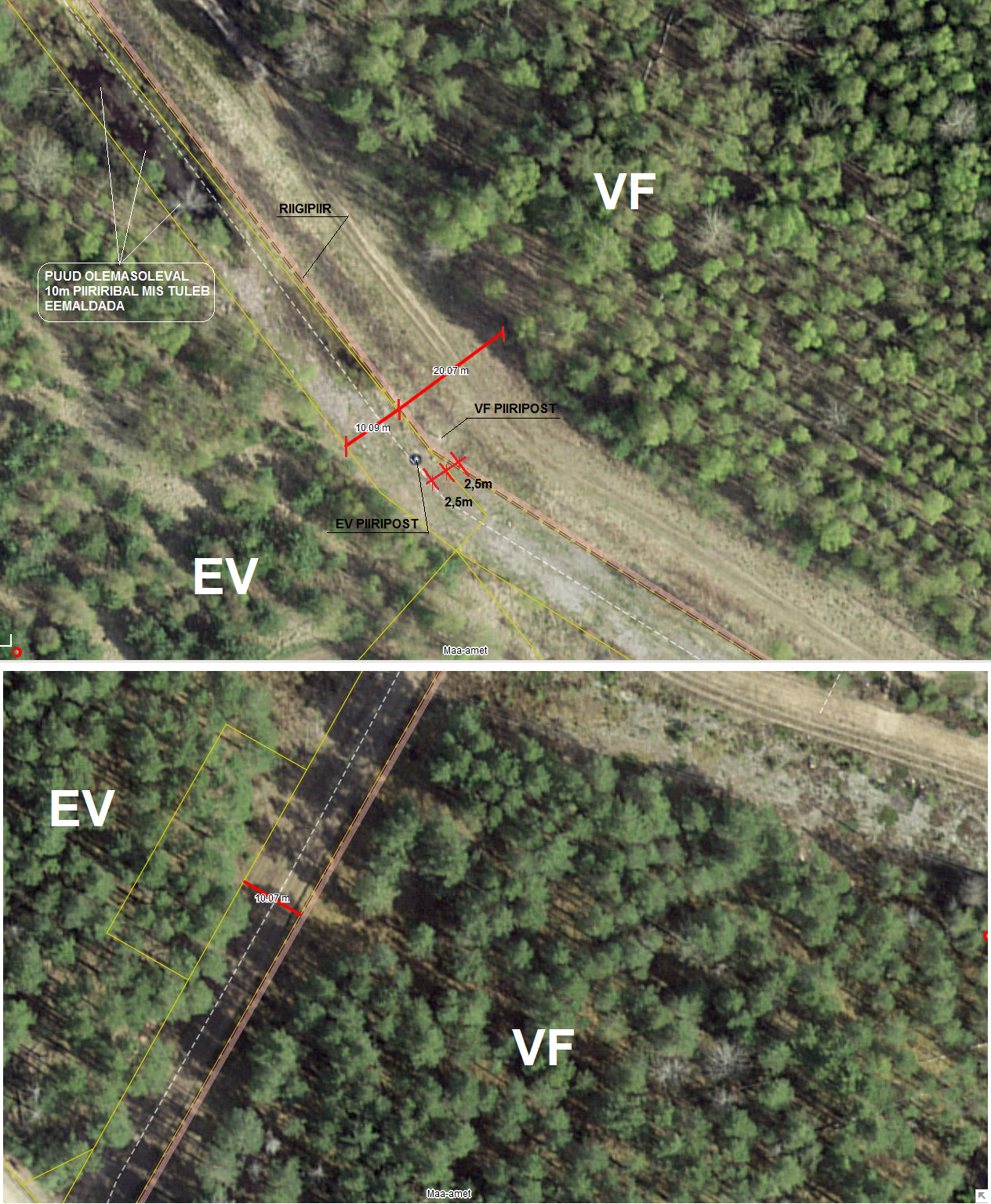 Siin paar näidet erinevatest kohtadest. Maa-ameti fotod: 17.05.2017 Lend. Ülemisel fotol on näha koht, kus VF poolel on puhastatud piiririba ca 20m laiuselt ja EV poolelt paihuti ca 10m laiuselt (ning paiguti 17.05.2017 seisuga puhastamata).