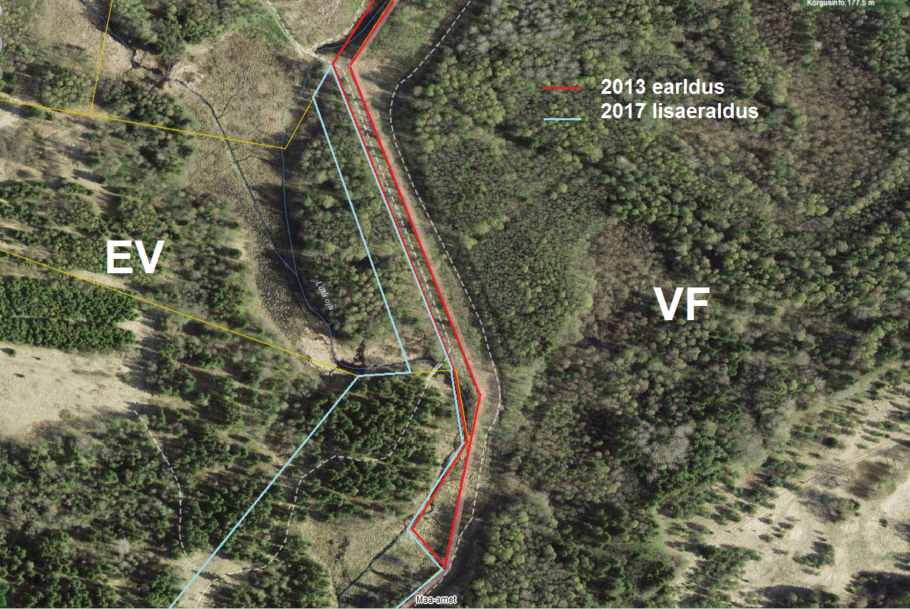 Punasega on antud 2013a maakatastris registreeritud riigi omandis olev "piiririba" (riigikaitsemaa) ja sinisega on antud 2017a juurdelõiked eraomandist.