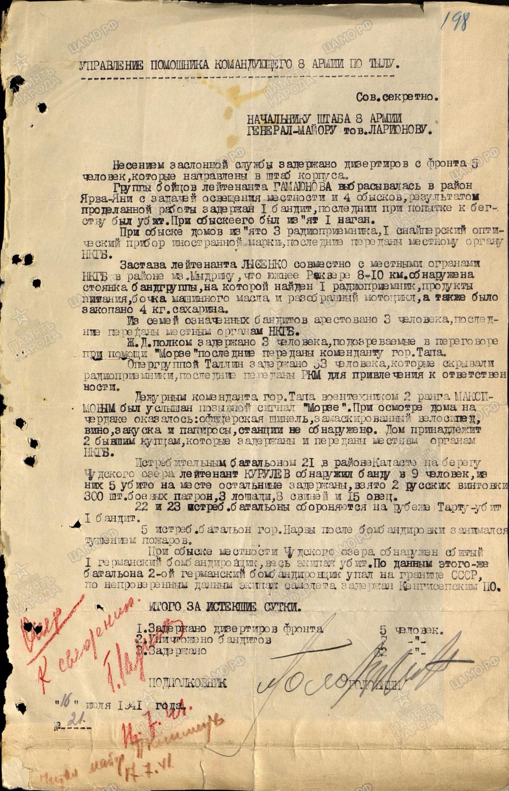Pikem dokument on 291. jalaväediviisi operatiivosakonnale 19.juulist 1941.