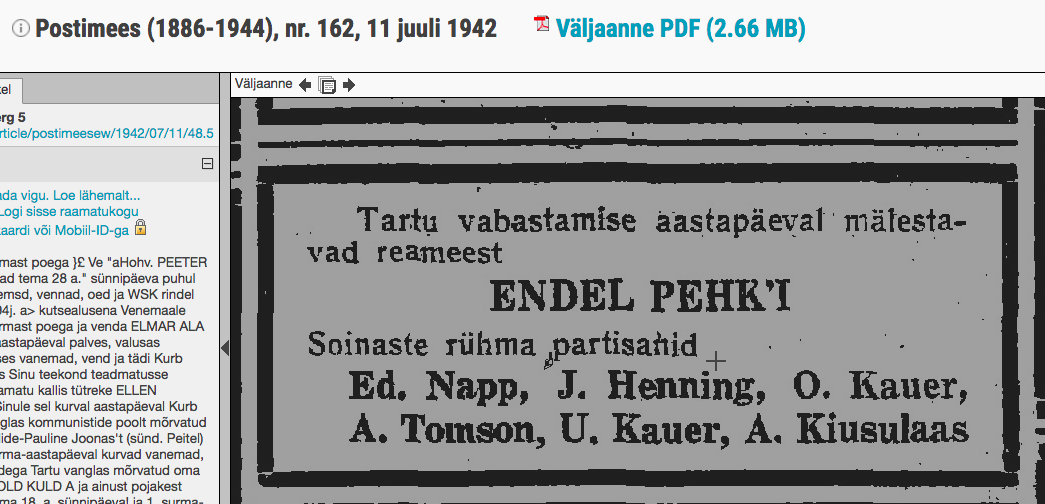 Endel Pehk 1913 Tartu / Partisan, Tartu lahingus langenud