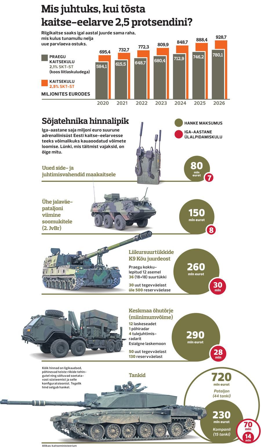 Eesti saaks 2,5-protsendise kaitse-eelarve korral 2026. aastaks teoreetiliselt soetada nii keskmaa-õhutõrje kui ka tankid. Tõsi, nende võimetega kaasnevad püsikulud nõuaks tuleval kümnendil ilmselt juba uut kaitsekulude tõstmist.