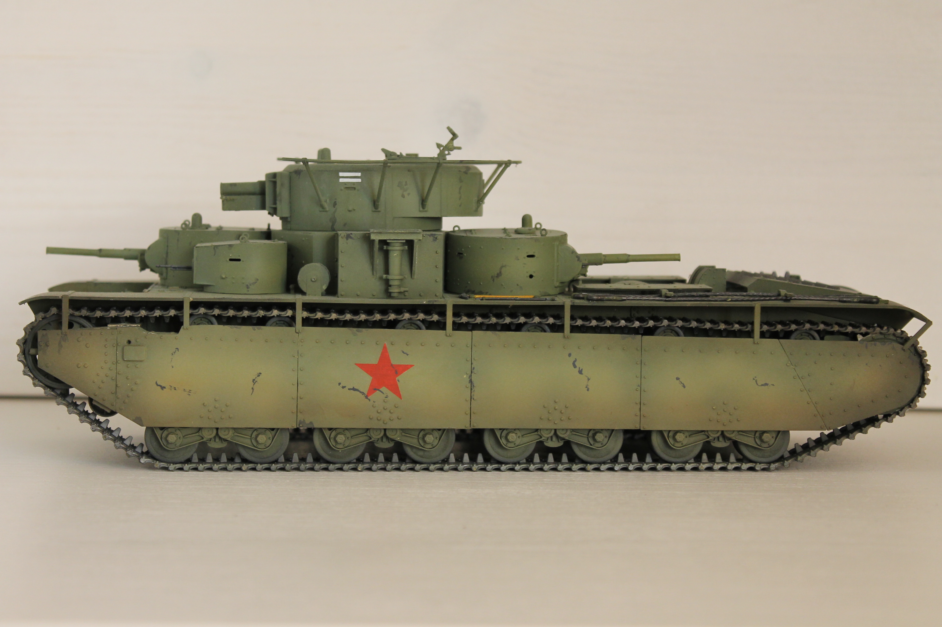 T-35 jätab väga hea mulje, ühinen sinu arvamusega – mudel on tõesti kiidusõnu väärt. Mõned detailid seal siiski on, mis friikidele rahu ei anna, no näiteks on puksiirtrosside kousid valatud – tegelikkuses olid need pleisitud ja pleisi kohad presendiribast mähistega kaetud. Paar pisiasja on küll veel, aga nii hea mudeli kallal pole mõtet norida. Masin (prototüüp) on valmistatud perioodil 1936 kuni 1938 teine pool, kuna 1936 aasta jooksul (täpne daatum seni teadmata) hakati summutit peitma mootoriruumi sisemusse ning 1938 aasta lõpust läksid tootmisse juba koonilise torniga masinad.