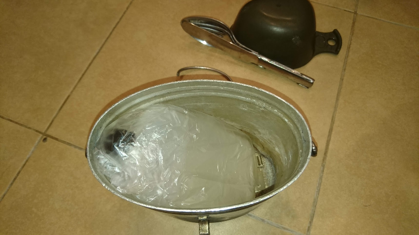 Kõigepealt tuleb panna katelokki piiritusepudel - soovitan panna kilekoti sisse, siis ei imbu piiritus katelokki. Seejärel tuleb panna katelokki noa-kahvli-lusika komplet ja joogitops. Esimestel proovimistel ei tarvitse kogu see kraam jääda õige nurga alla ja selle tõttu ei saa kaant peale panna, aga kui oled leidnud õige nurga, siis saab ka kaane peale panna. Kaas tuleb kergelt peale suruda ning sees olevad asjad jäävad surve alla ja selle tõttu ei kolise.