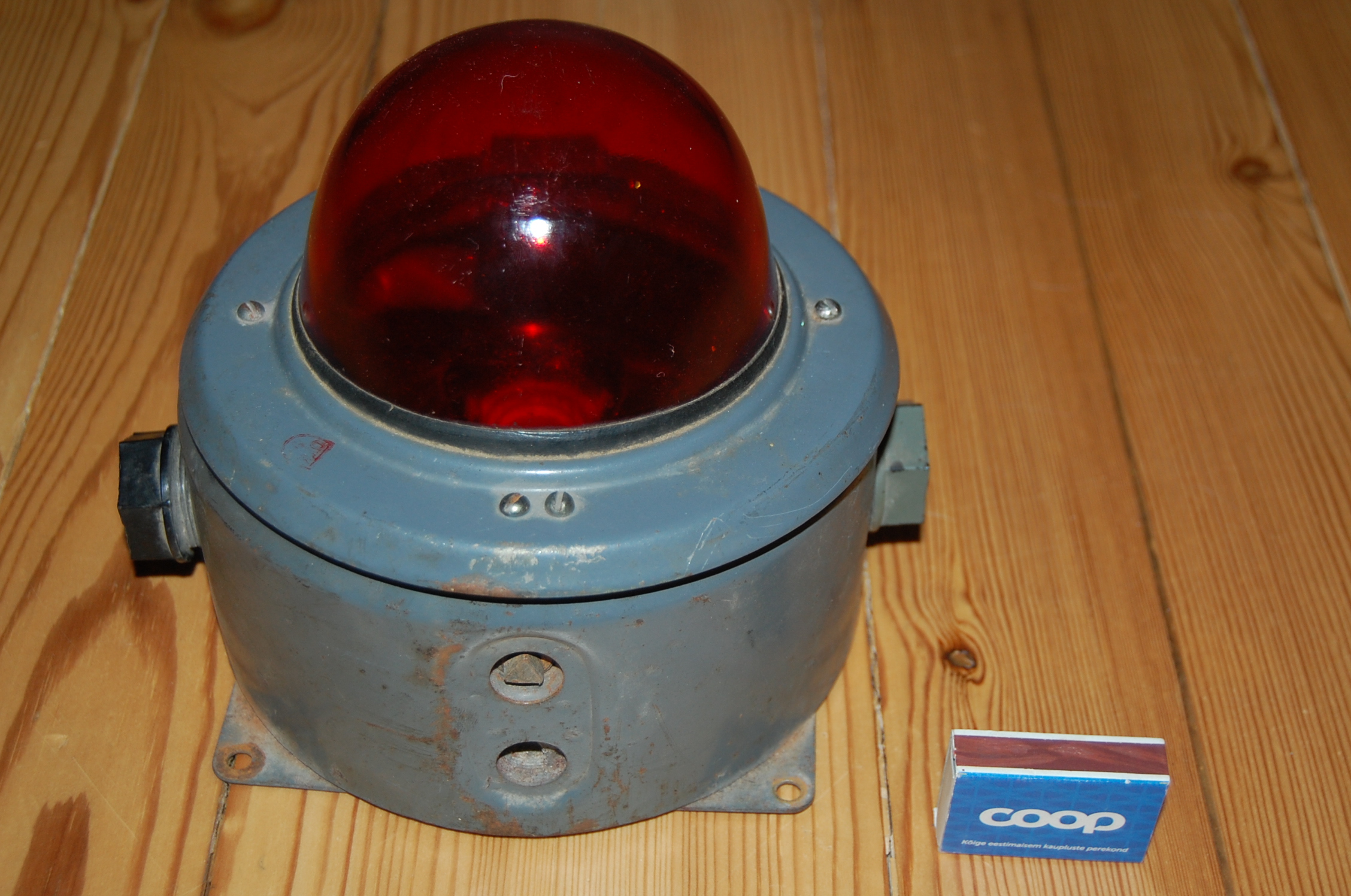 Müügis metallkorpuse ja punase klaasiga laternad, sobilik militaristi garaaži või kasvõi soomukisse valgusdistsipliini tagamiseks. :) Robustse disainiga, üks lamp kaalub 1,5 kg. Peal märge 220V 15W, aastaarv 1975. Kuppel avaneb kolmnurkse elektrikilbi võtmega. Kõik lambid enam-vähem sarnases seisukorras, esineb kohati natuke pindmist roostet. Kuplil on ümber ka kummitihend, seega võimalik ka välitingimustes kasutada.