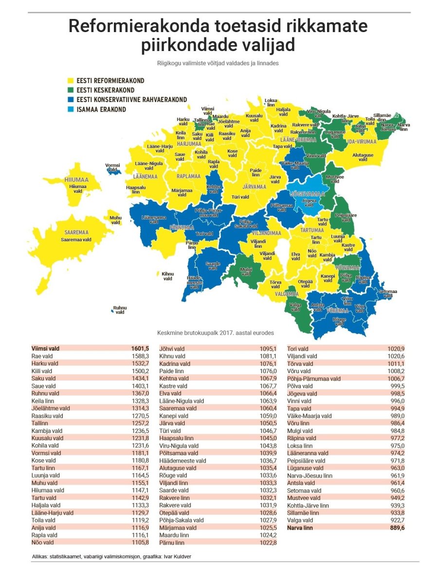 Kolme Eesti suurema erakonna – Reformierakonna, EKRE ja Keskerakonna – valijad langetasid oma otsuse paljuski rahakotiga: Reformierakonna saak kasvas sedamööda, mida suurem oli neile toetuse andnud piirkonna elanike sissetulek. Statistikaameti andmeil oli Viimsis Pringi kandi elanike 2017. aasta brutosissetulek keskmiselt 1688 eurot kuus. Üle 400 euro rohkem, kui oli sel ajal Eesti keskmine palk. Nende toetus oli seal 46,6%. Sama muster kordub ka teistes Tallinna ja ka Tartut ümbritsevates jõukates omavalitsustes, kus on enim toetatud just Reformierakonda. Nõnda näitab ka statistika, et Reformierakonna häältesaagi ja neid toetanud piirkondade sissetulekute vahel on tugev korrelatsioon. Mida jõukam valija, seda populaarsem on Kaja Kallase juhitud partei.