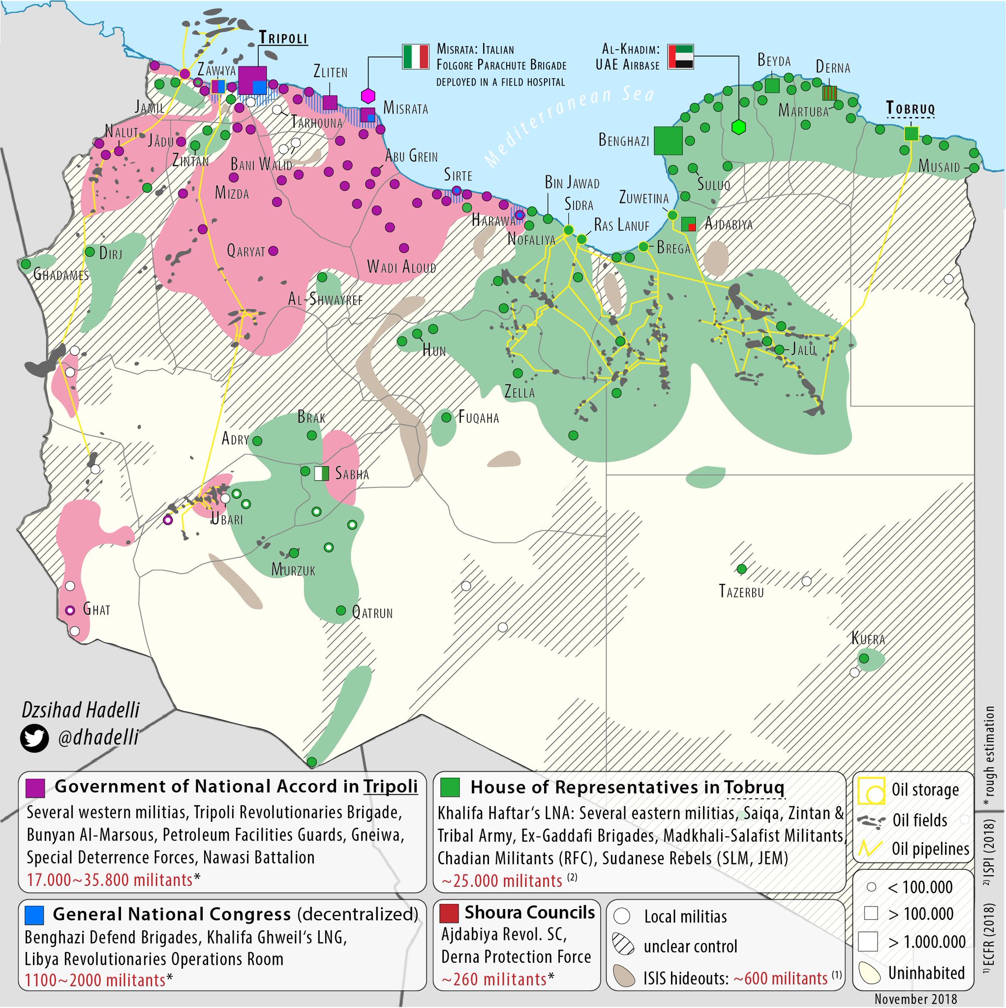 Praegu on Liibüa jagatud kahe valitsuse vahel. Tripolis valitseb ÜRO toetusega ühtsusvalitsus, idapoolses Tobruki linnas Haftari toetatud nn idavalitsus. Lisaks neile on riigis veel terve hulk relvajõudusid, mis kontrolli pärast konkureerivad. Seda eriti riigi hõredalt asustatud lõunaosas, kus hõimud võitlevad tulusate piiriüleste smugeldamisteede ja inimkaubanduse eelisõiguse eest, vahendab France 24.