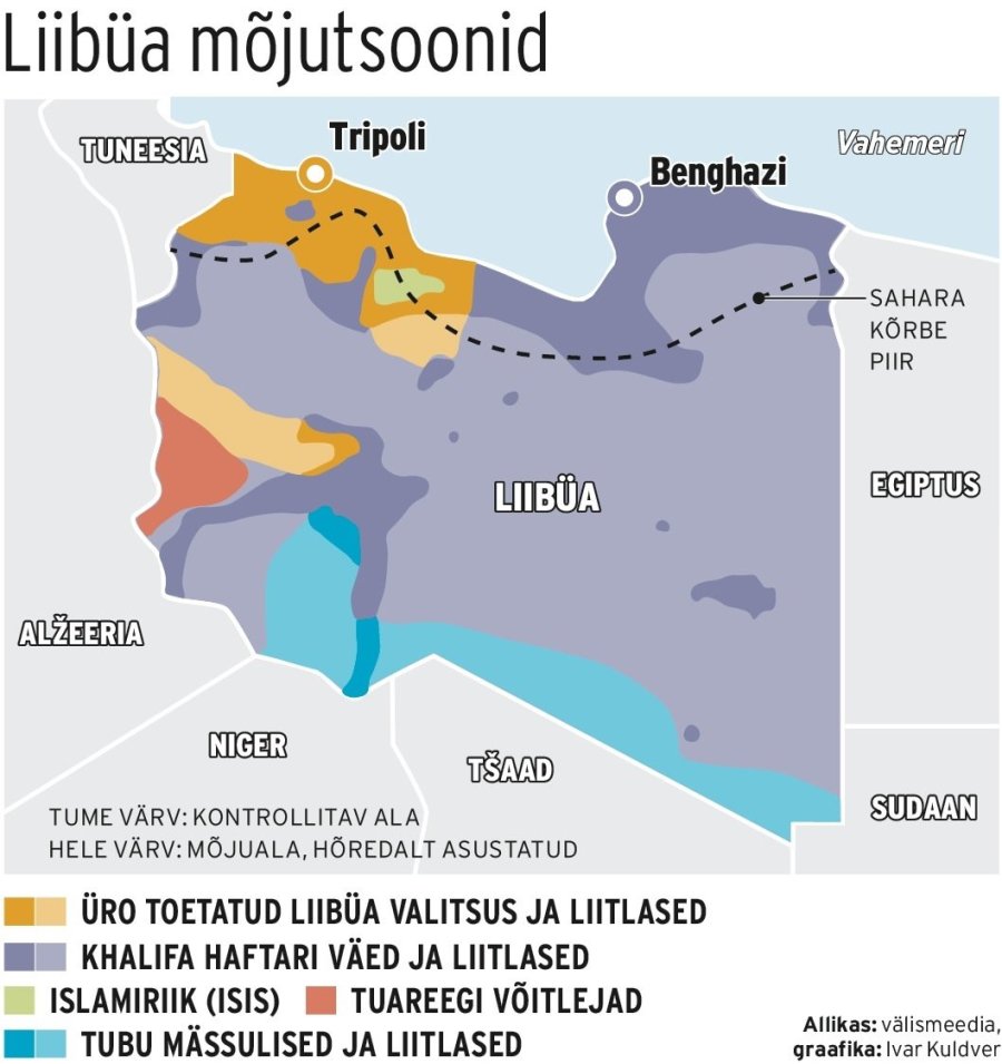 Praegu on Liibüa jagatud kahe valitsuse vahel. Tripolis valitseb ÜRO toetusega ühtsusvalitsus, idapoolses Tobruki linnas Haftari toetatud nn idavalitsus. Lisaks neile on riigis veel terve hulk relvajõudusid, mis kontrolli pärast konkureerivad. Seda eriti riigi hõredalt asustatud lõunaosas, kus hõimud võitlevad tulusate piiriüleste smugeldamisteede ja inimkaubanduse eelisõiguse eest, vahendab France 24.