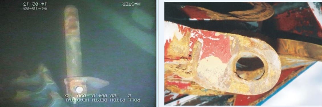 Põhja-polt (Atlandi luku polt) oli terve ja suuremate kahjustusteta - diameeter 78mm. Vööri poolsed 3 puksikinnitusaasad olid purunenud - aasade kõige kitsamatest kohtadest ja piki puksi keevisõmblust aasaga. Visiiri poolne aas oli terve, aga välja venitatud - originaalne läbimõõt 85mm, peale ülestõstmist 83x95mm. Ilmselgelt selliseid vigastusi simuleerida on väga keeruline. Vööripoolsed aasad purunesid paari kõvema lainelöögi järel. Visiiri liikuma hakkamisel väänas polt visiiripoolse aasa ovaalseks ja libises sealt välja.