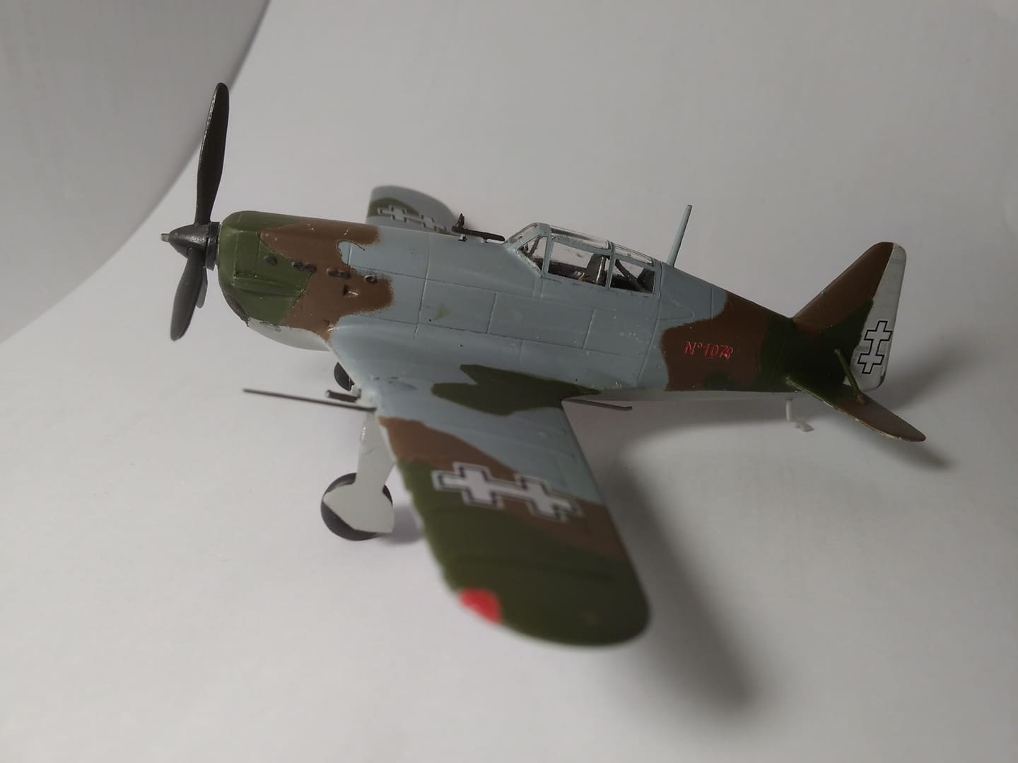 Nüüd Hobby Bossi viga selle mudeli osas (lisaks sellele, et see kuulipilduja sihik on keset keret, peab olema aga kere keskjoonest paremal) on tiibadel olevate tugevduste puudumine. St "triibud" tiibadel olid plymax lisakihid (vineer + duralmiinium). Hobby Bossil olid need triibud süvistatud...peavad olema aga tiiva pinnast kõrgemal (AZURi mudelil on see korrektne). Lõikasin ja kleepisin siis need tugevdused teeküünla alumiiniumist välja...jäid pisut laiad. Värvimine pisut ebaõnnestus.