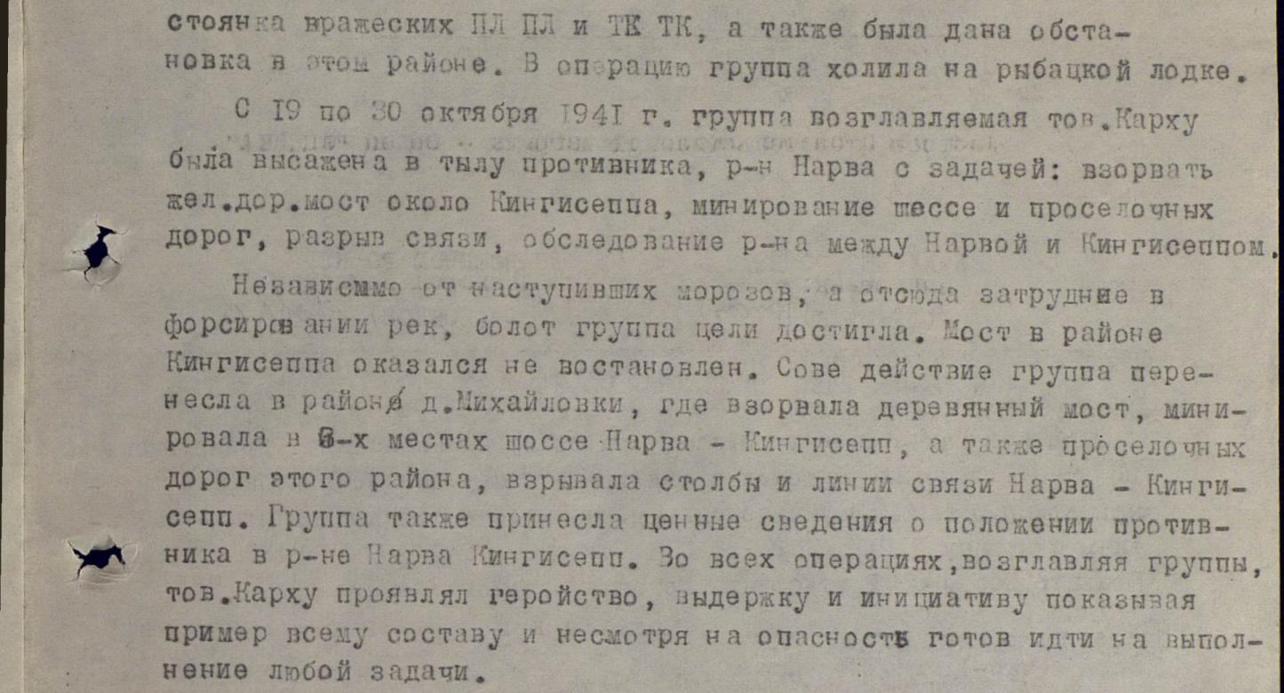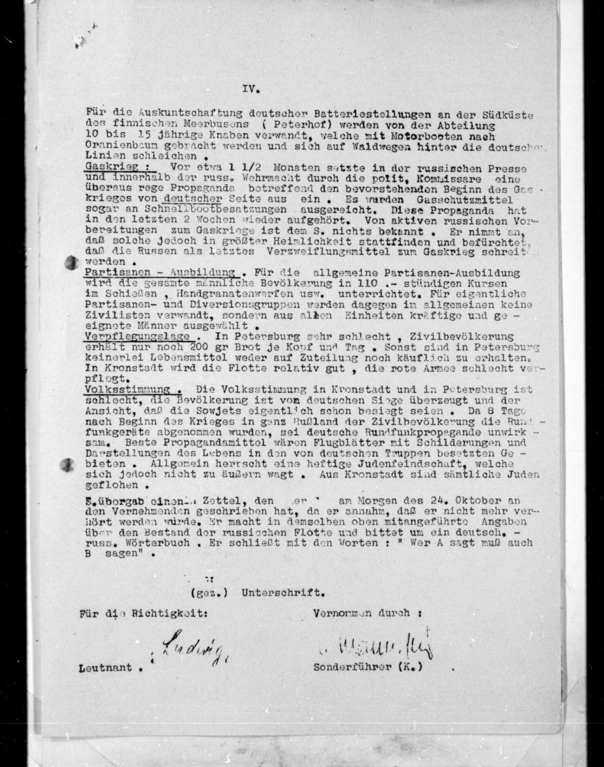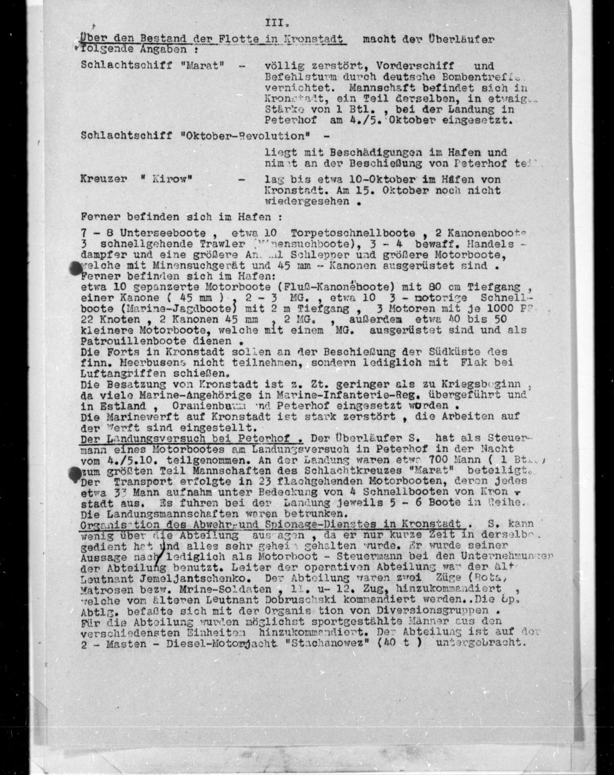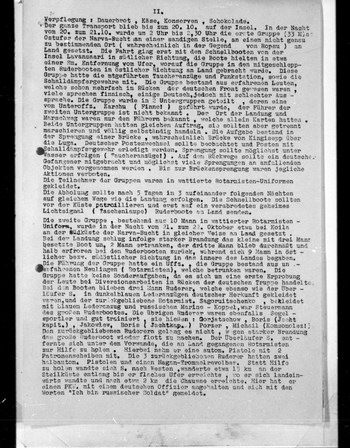 „Ein heute festgenommener russischer Matrose gibt an, daß vor 5 Tagen mit 2 Booten etwa 50 Mann von Kronstadt kommend nach der Insel Lawansaari, von dort am Abend des 20.10. und am Abend des 21.10. 2 Boote mit je etwa 10 Mann an die Küste geschickt worden seien. Landungsziel vermutlich Lugamündung. Ausstattung des einen Bootes mit einem Radiosender und Sprenggerät sowie Taucheranzug. Auftrag angeblich Sprengung einer Brücke bei Kingisepp. Das andere Boot ist in der Gegend von Toila gelandet. Mannschaft verstreut. Absuchen der Gegend von Toila von hier aus veranlaßt.“