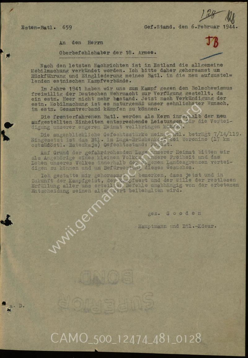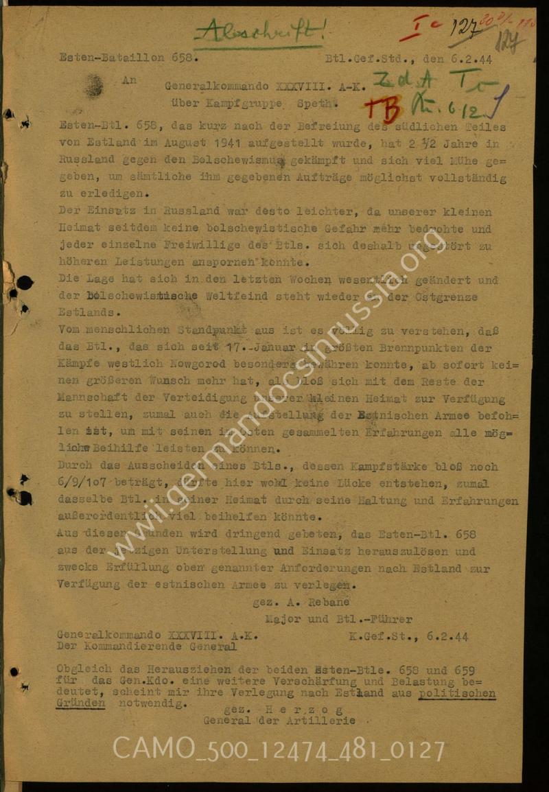 Die estn. Einheiten Ost-Btl.658 und Ost-Btl.659 am 1.8.43 an die SS übergeben. Sie bleiben bis auf weiteres in ihrem derzeitigen Einsatz.