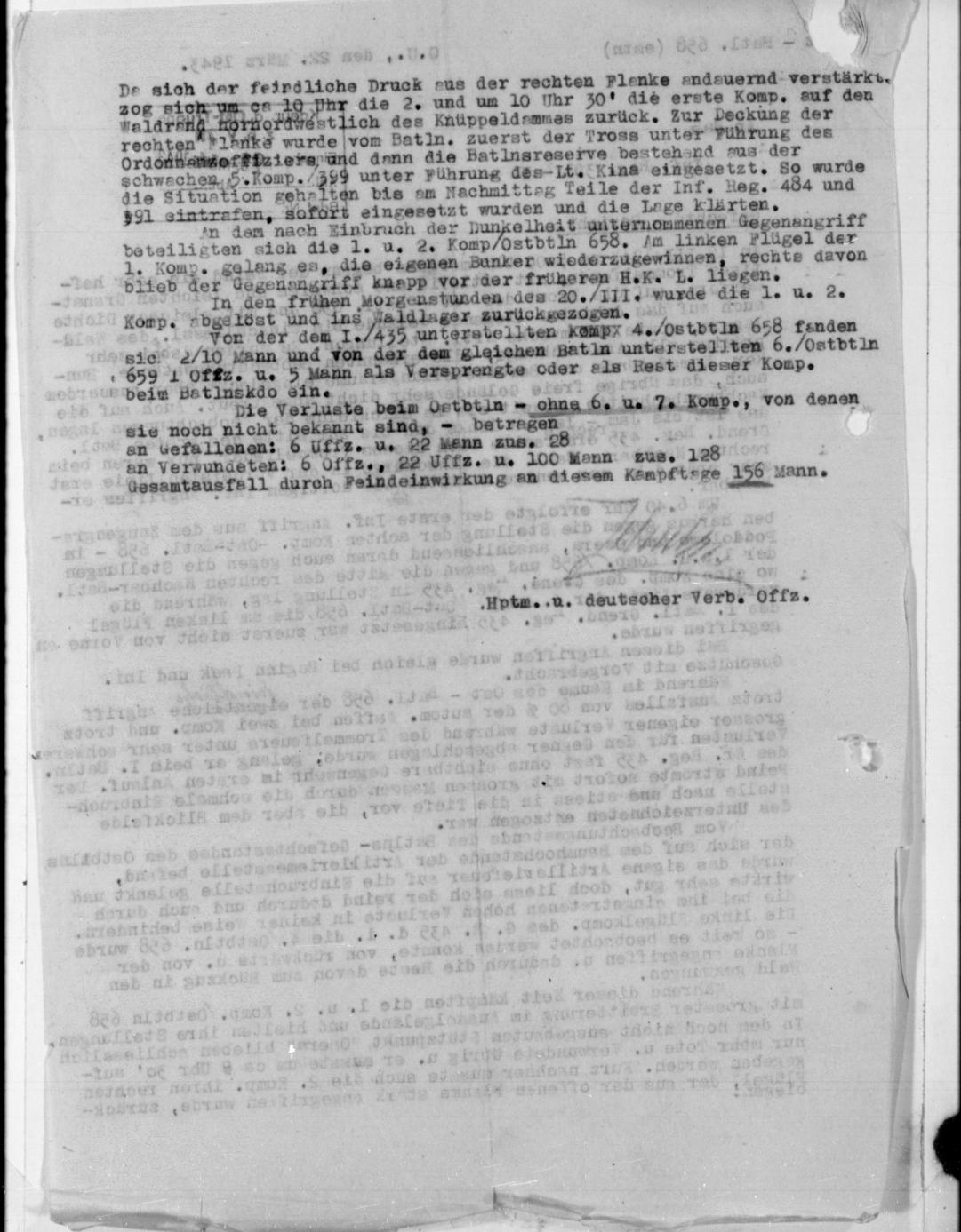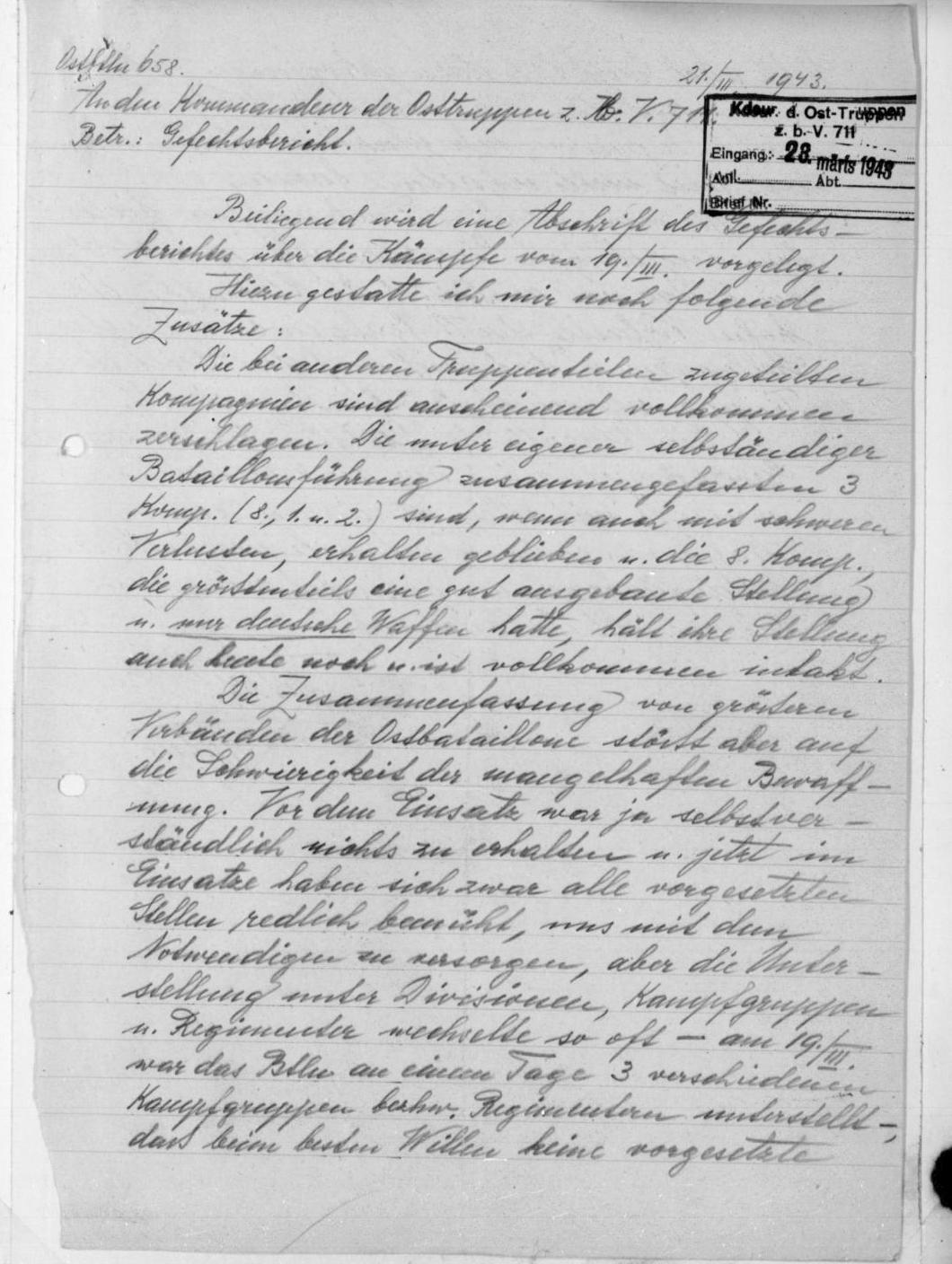 Ost-Batl. 658 (estn.) herausgezogen und ersetzt durch 9./660 (estn.) und Teile des Wachbatl. 150. […] Stab Ost-Btl. 658 mit 1., 2. u. 4. Kp., ferner Stab Ost-Batl.659 mit 5., 6., 7. u. 8. Kp. sind aus dem Bereich Kdt.r.A.583 ausgeschieden.