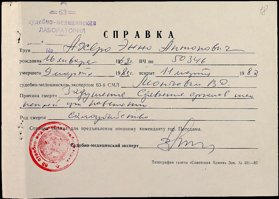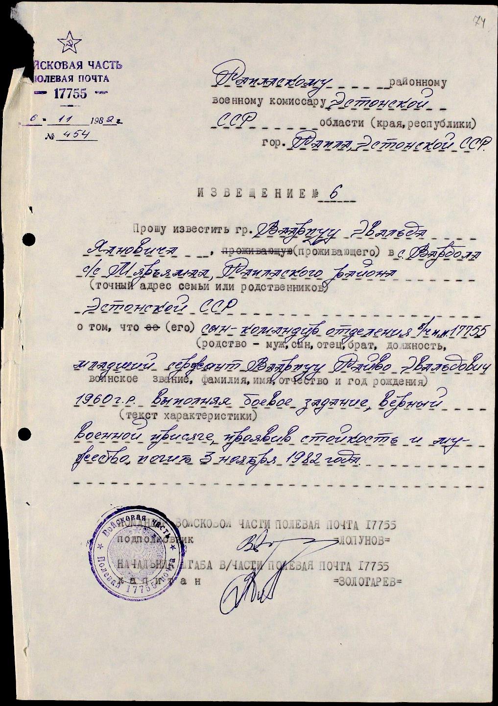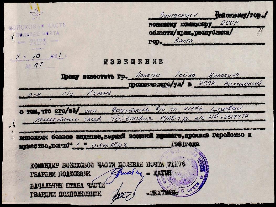 - Järgmine kiri: „Minu poeg Aimur Raemets teenis aega Nõukogude Liidu armees 1965. aastal Gomelis. Enne teenistusaja lõppu ta hukkus. Oli 17. aprill 1967. aasta. Aimur oli minu ainuke poeg. Rohkem mul lapsi ei ole olnud. Olen sündinud 17. aprillil 1916. aastal. Minu sünnipäeval sai Aimur surma. Abikaasa suri 1960. aastal, seega olen ja elan üksi. Leinariided on kulunud, must mure ja lein on jäänud. Erika Raemets, Põlva maakond, Leevi sidejaoskond.“