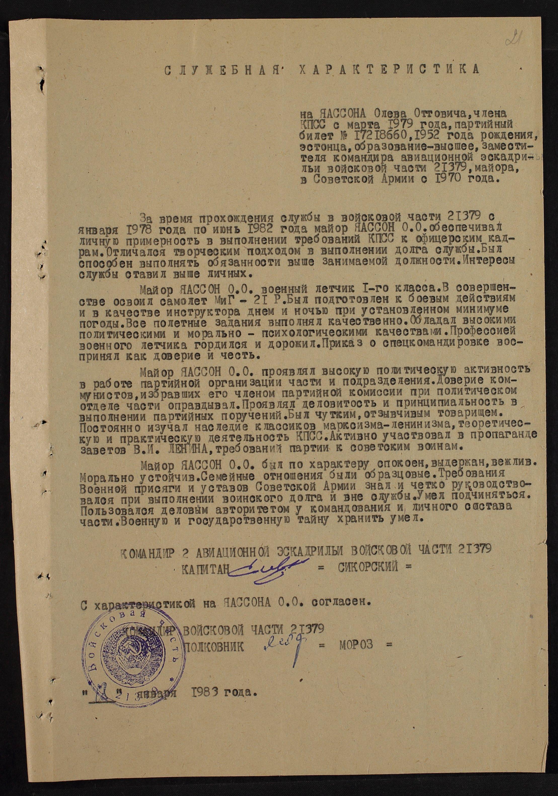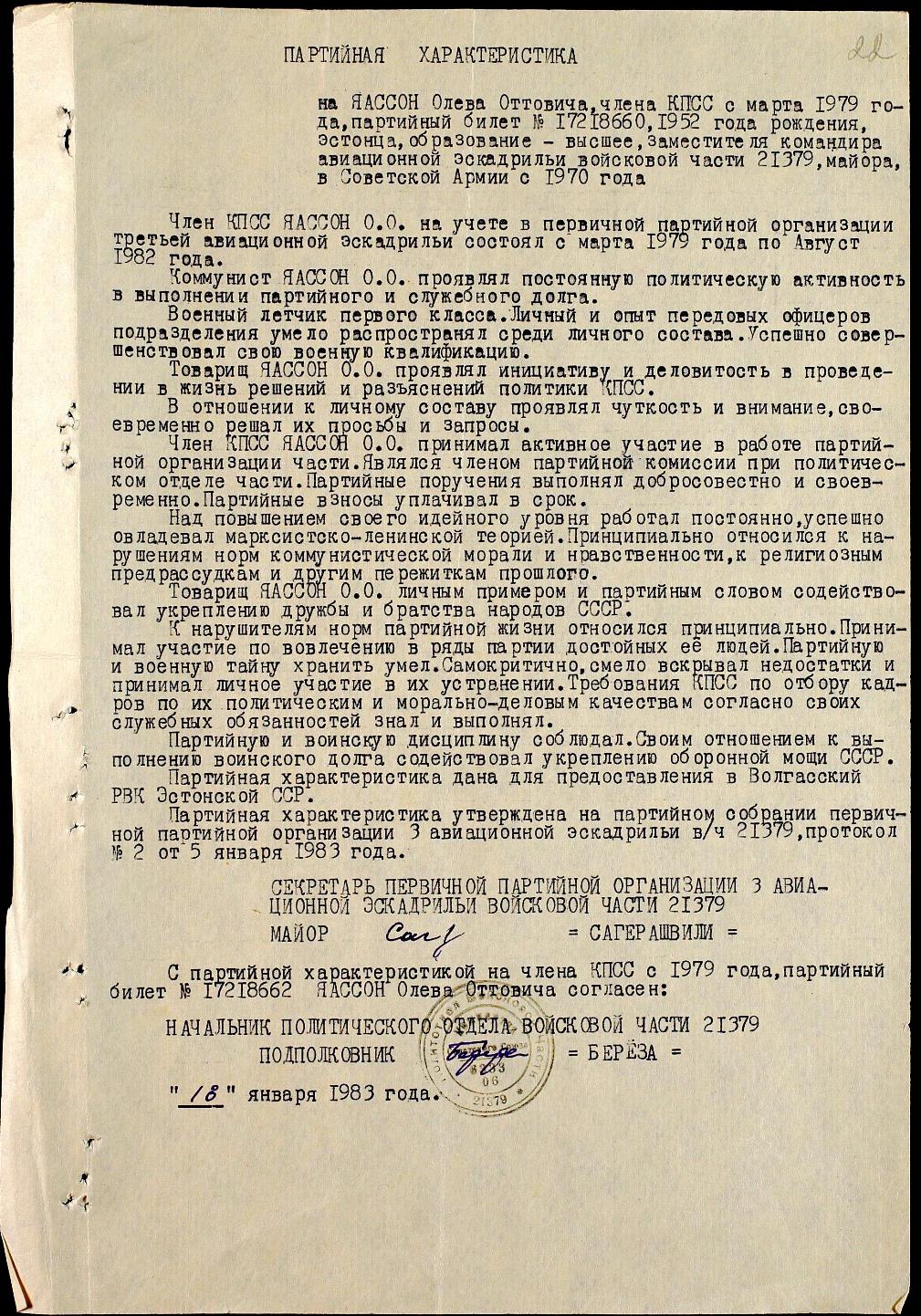 ЯАССОН Олев Оттович, майор, зам. ком-ра авиац. эскадрильи, летчик 1 класса, род.16.4.1952 в г. Антсла Эст. ССР. Эстонец. В Вооруж. Силах СССР с 7.8.70. Окончил Ка-чинское ВВАУЛ.