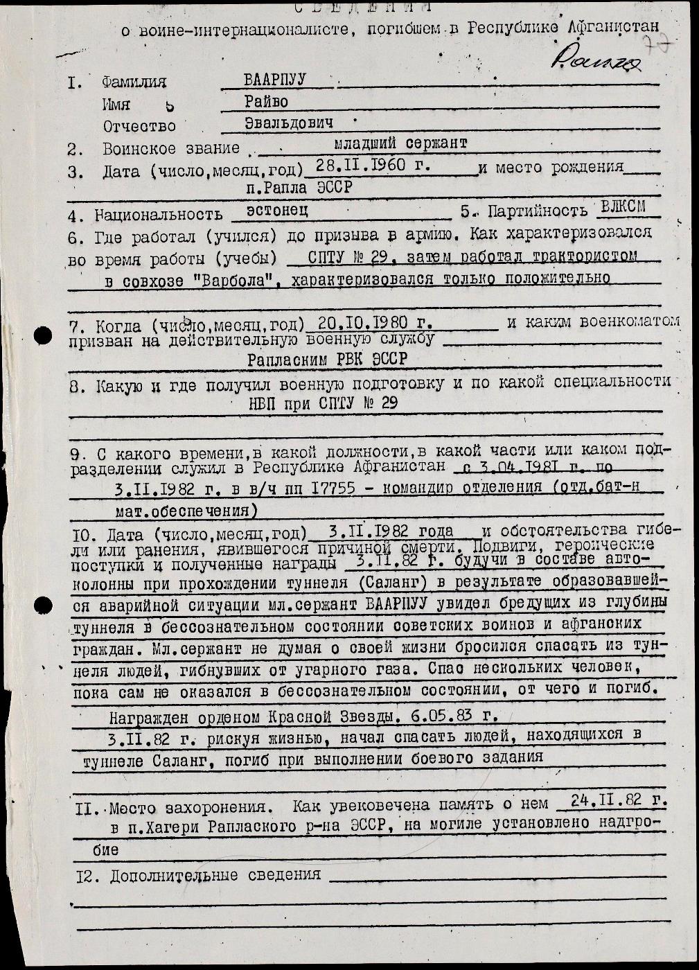 Üks eestlane hukkus ka Afganistani sõdade ohvriterohkemas lahingus, mil mudžahiidid sulgesid Salangi mäekurus tunneli, milles oli Nõukogude armee sõjaväekolonn. Salangi tunnelis suri 1982. aasta 3. novembril vingumürgitusse 176 sõjaväelast, nende hulgas nooremseersant Raivo Vaarpuu.