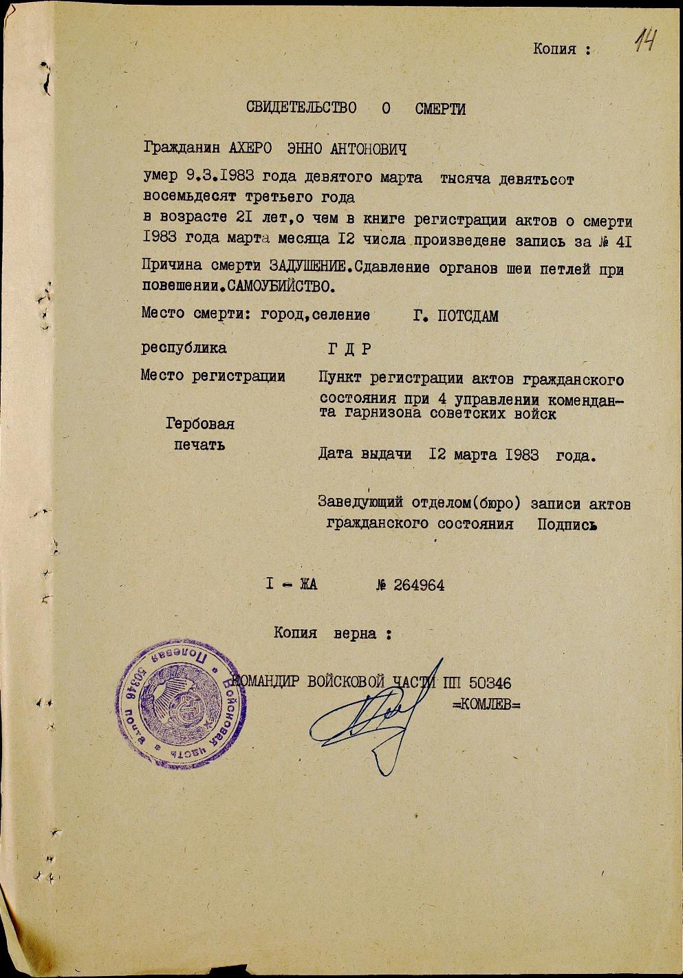 Kiira Kahn: - „Minu poeg Enno Kender tapeti 27. juunil 1971. aastal sõjaväes, ta teenistuskoht oli Karjalas. Põhjuseks kirjutati: uppus sõjaväe kohustuste täitmisel. Kodus aga leidsime, et kukla taga oli kolme sõrme suurune haav, vett oli sees ainult pool klaasi. Ilmselt oli enne tapetud ja siis vette visatud. Sellepärast ei tahetud teda meile kätte anda ja taheti matta sinna, kus ta teenis, kuid meie tõime ta ikkagi ära ja matsime Järva-Peetri surnuaeda Järvamaal.“