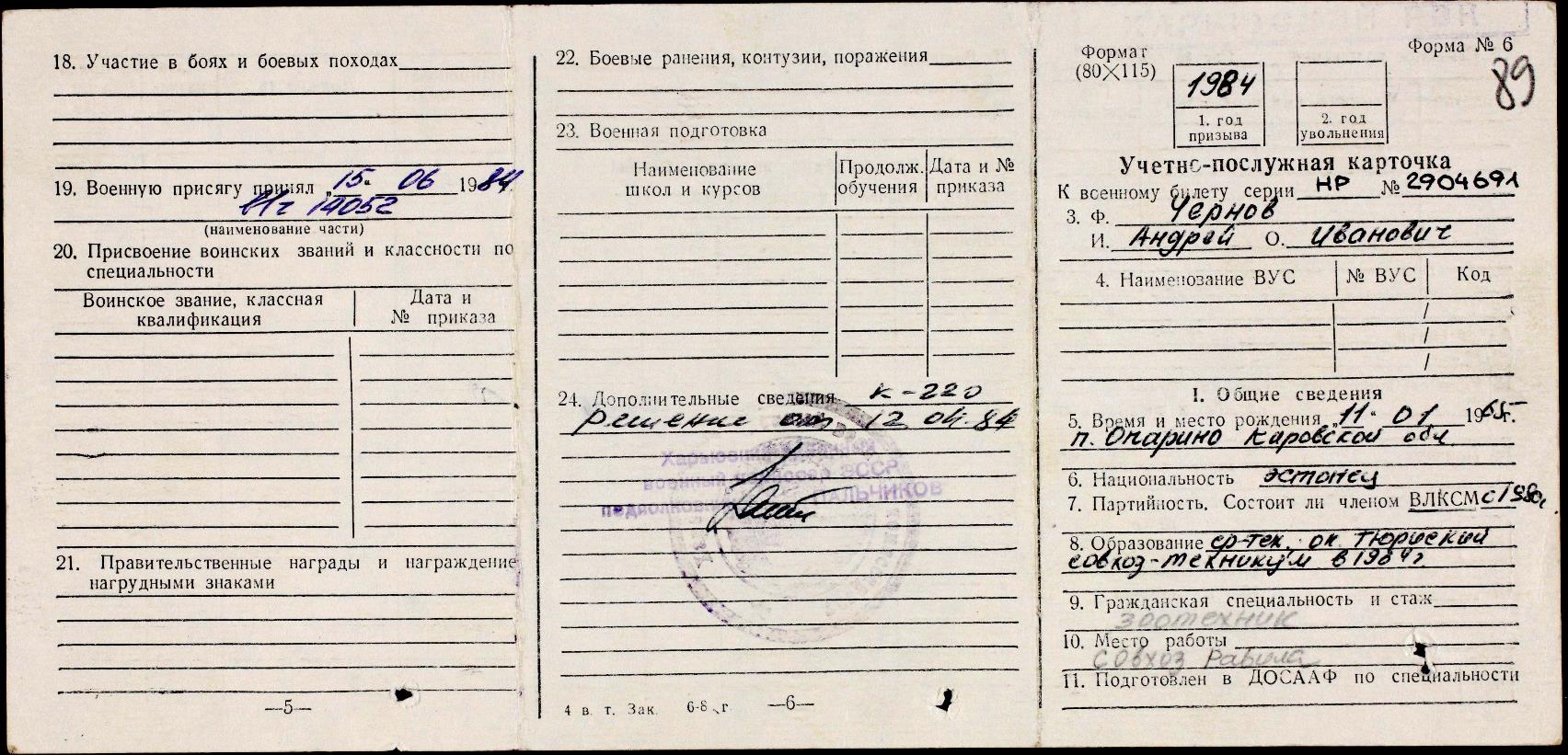(vaatamata vene nimele ja sünnikohale Venemaal Oparino asulas, Kirovi oblastis, Oparino rajoonis on rahvus märgitud sõjaväe piletis ja passis "eestlane". Lõpetanud Türi tehnikumi zootehniku erialal 1984a)