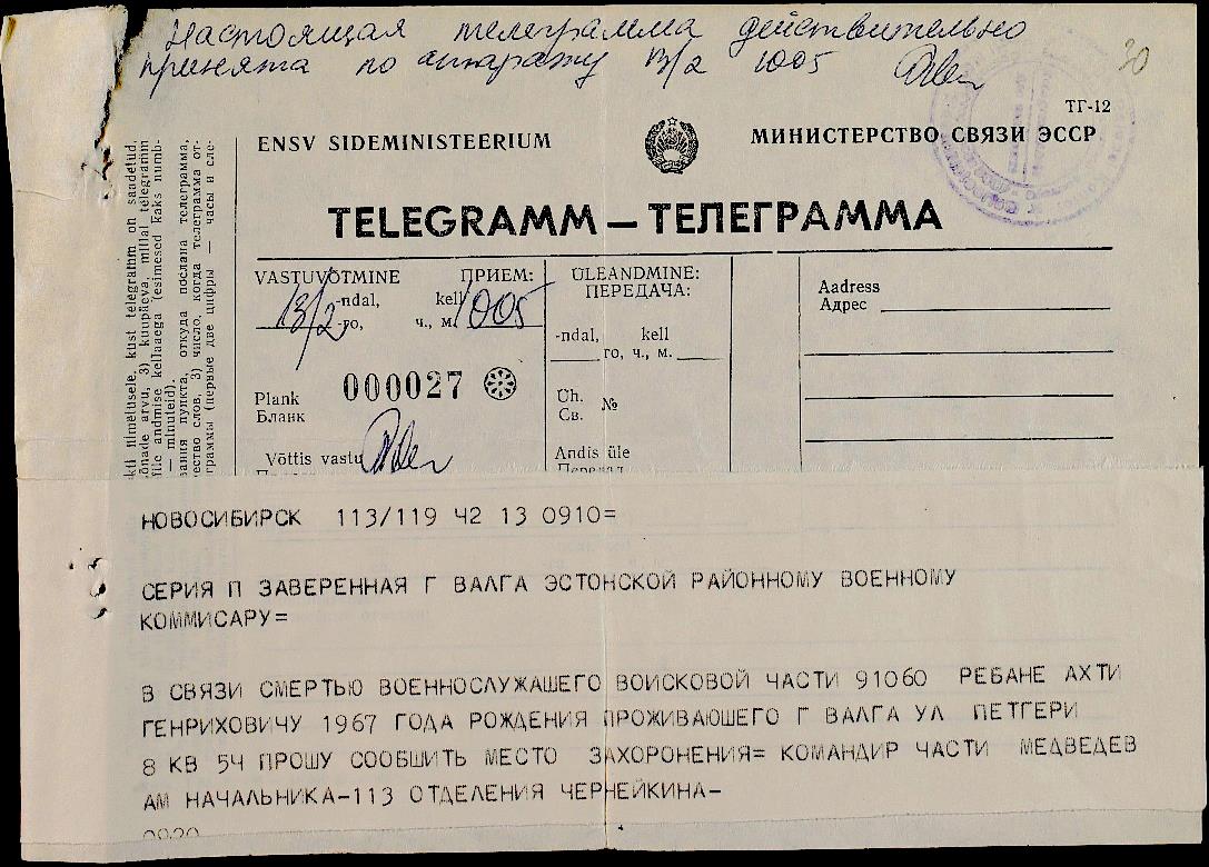 https://virumaateataja.postimees.ee/230 ... ppenud-eluLaual on põlev küünal ja pildialbum. 2. juulil 1988. aastal suri Taškendi sõjaväehaiglas Afganistanis haavata saanud Harri Väli. Teadaolevalt oli ta viimane Eestist pärit surmasaanu tolles sõjas. Oma poega meenutab ema Valve Väli.....