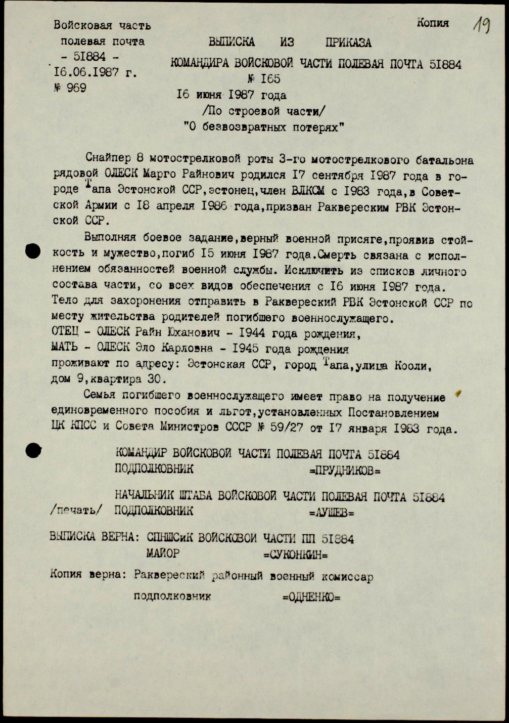 https://epl.delfi.ee/kultuur/afganistan ... d=5103053515. juunil hukkus reamees snaiper Margo Olesk, sündinud Tapal, töötas enne sõjaväeteenistust Nõmmküla sovhoosi traktoristina. Teenis kordonis, mis julgestas liikumist ühel Kabuli–Dalalabadi teelõigul. Ta märkas, et kokkupõrke ajal üritasid kolm mudahiidi tungida märkamatult seljatagant kordonisse, ning langes nende peatamise katsel. Margo Olesk on maetud Kadrinasse.