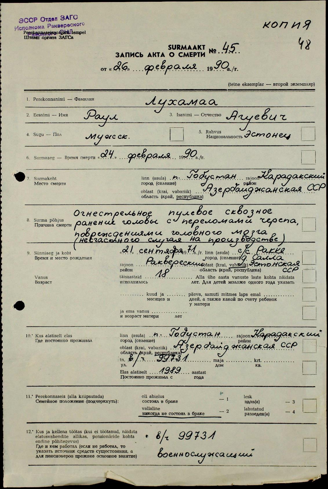 Eesti sõjaväeteenistusest keeldujate organisatsioon ”Genf 49” on saanud informatsiooni veel ühest tapetud Eesti ajateenijast vene sõjaväes. 28. veebruaril teatas Topi külas elav pensionär Maria Lahe, et tema poeg Raivo Lahe, kes on sündinud 1971. aastal, mõrvati 13. veebruaril.
