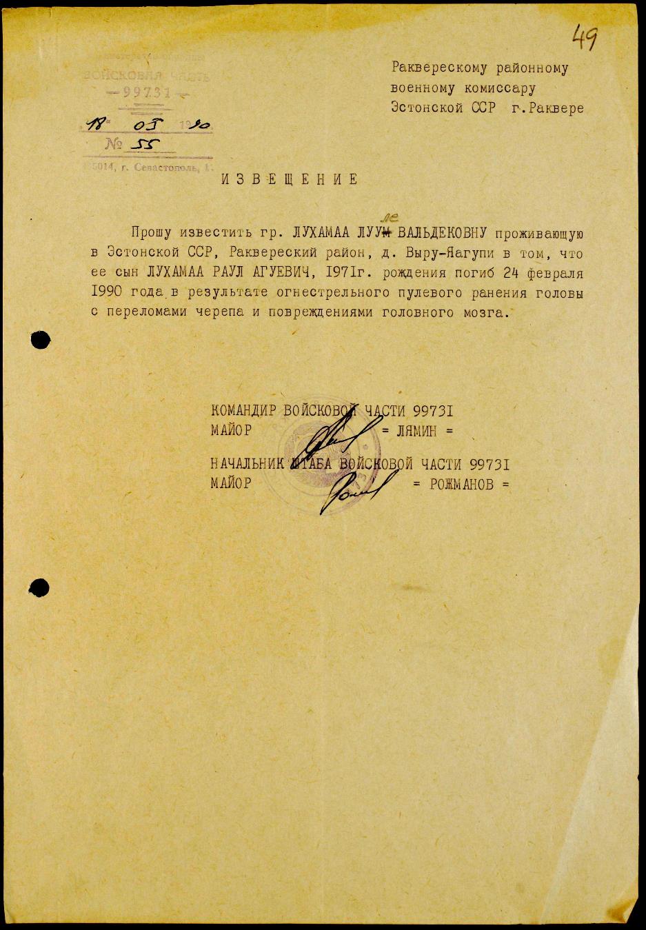 Raivo Lahe oleks pidanud vabanema 12. või 13. veebruaril tervislikel pohiustel. Aga enne seda tapeti ta vägivalaselt, kuigi surmatunnistuses on öeldud, et surmapõhjuseks oli mehhaaniline lämbumine. Matusepäeva hommikul tehti Lahest pilt, millel on naha vigastusi näol ja kaelal. Neli päeva enne surma käis isa poega vaatamas. Poeg oli sõjaväehaiglas seoses närvide ravi ja vasema jala varbaluu murruga. Siis tal mingeid vigastusi näol ei olnud. Enne kojusaatmist pidi ta veel väeosast läbi minema. Sõjaväekomissariaadist tuli pärast selle "kohustuse” täitmist teade, et "Raivo Lahe poos ennast väeosas üles”. Vanemad ja tuttavad ei usu seda versiooni. Pealegi oli poisi nägu vigastatud, purustatud olid ka sõrmenukid. "Genf 49” juhtiv tegelane Jüri Liim kommenteerib sündmust: — Jätkuvalt tapetakse punaarmees poisse. Ka meie valitsus vaikib või kutsub ainult üles sõbralikult suhtuma armee vajadustesse.