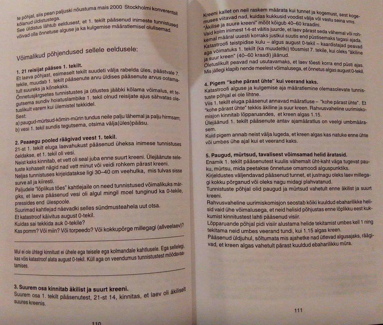 ja nagu ma siin teemas mitu korda olen välja öelnud, siis mind ei eruta eriti see "uus avastus" ja mingi lõhe/pragu/auk Estonia pardas, kuivõrd muud vastamata küsimused, mida JAIC üldse ei käsitle või millest ta lühidalt ning umbmääraselt üle libiseb. Ma loodan väga, et kui nüüd hakataksegi uuesti midagi uurima, et siis ei keskenduta ainult sellele uuele avastusele.