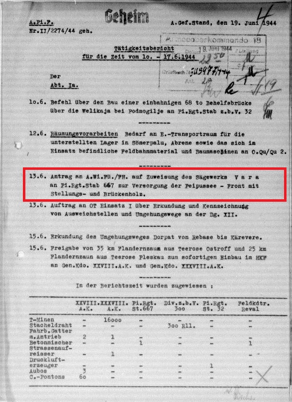 Seda versiooni kinnitab veel üks dokument- AOK18 pioneeriüksuste juhi tegevusaruanne 19.06.1944, kus 13.06 on esitatud taotlus armee majandusjuhile eraldada Vara saeveski Pi.Reg.Stab 667 käsutusse, et tarnida Peipsi frondi kindlustuste ja silla puitu.