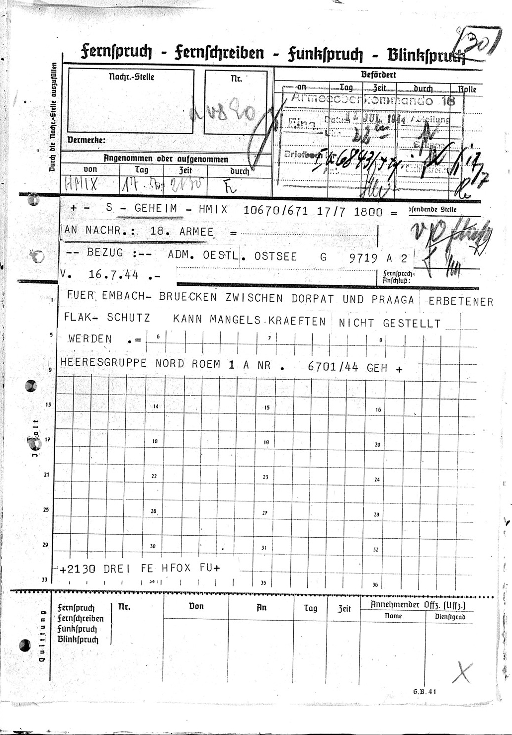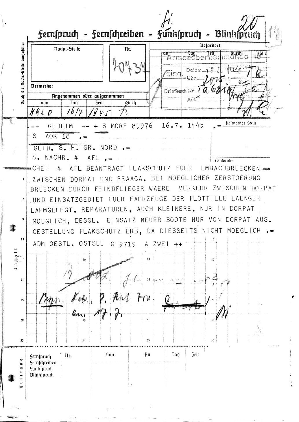 Nii, sai veel arhiivimaterjale läbi vaadatud ja siin on üks kiri, admiral Burchardi poolt saadetud 16.07.1944 väegrupile „Nord“ ja AOK18-le. Sisu on järgmine: 4.flotilli juht taotleb õhutõrjet Emajõe sildadele Tartu ja Praaga vahel. Sildade võimaliku hävitamisega vaenlase lennukite poolt oleks liiklus Tartu ja flotilli tööpiirkonna vahel kauemaks halvatud. Remonditööd, ka väiksemad on võimalikud ainult Tartus, samamoodi uuemaid kaatreid saab kasutada ainult Tartus. Õhutõrje tagamist vajame? kuna ilma ei ole võimalik ?