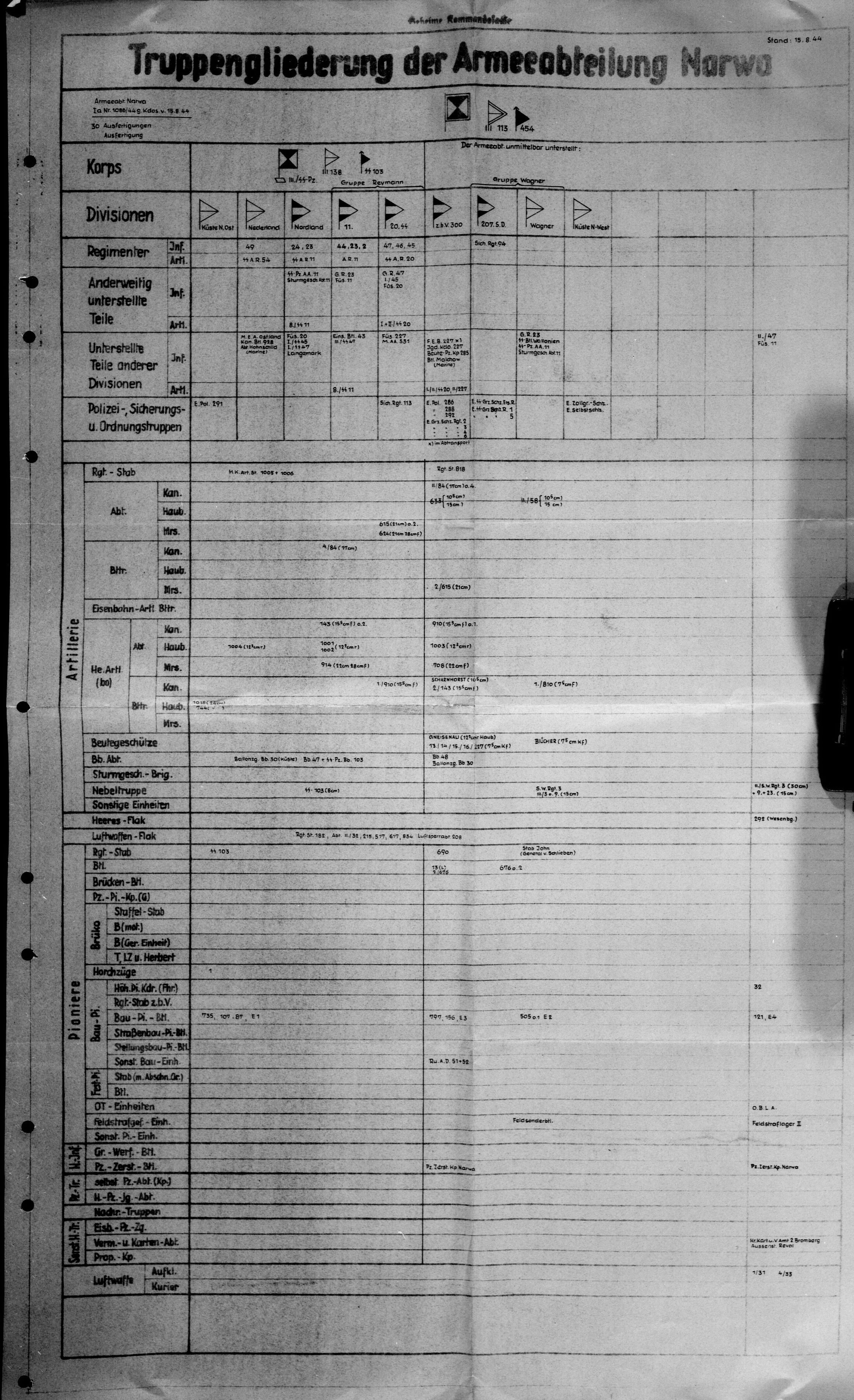 Aga tühi on ka rida Brücken - sillad. ?croman40 kirjutas:Otsisin akf rettile AA Narwa väeosade nimekirja seisuga 15.08.1944, mis on esimene selline ülevaade peale Emajõe piirkonna juhtimise ülevõtmist 13.08.1944. Nagu näha ei ole ühtegi pontooniüksust (neid näidatakse Brücko ridadel) enam seal piirkonnas. Seega pontoonsillast ei saa enam juttu olla.