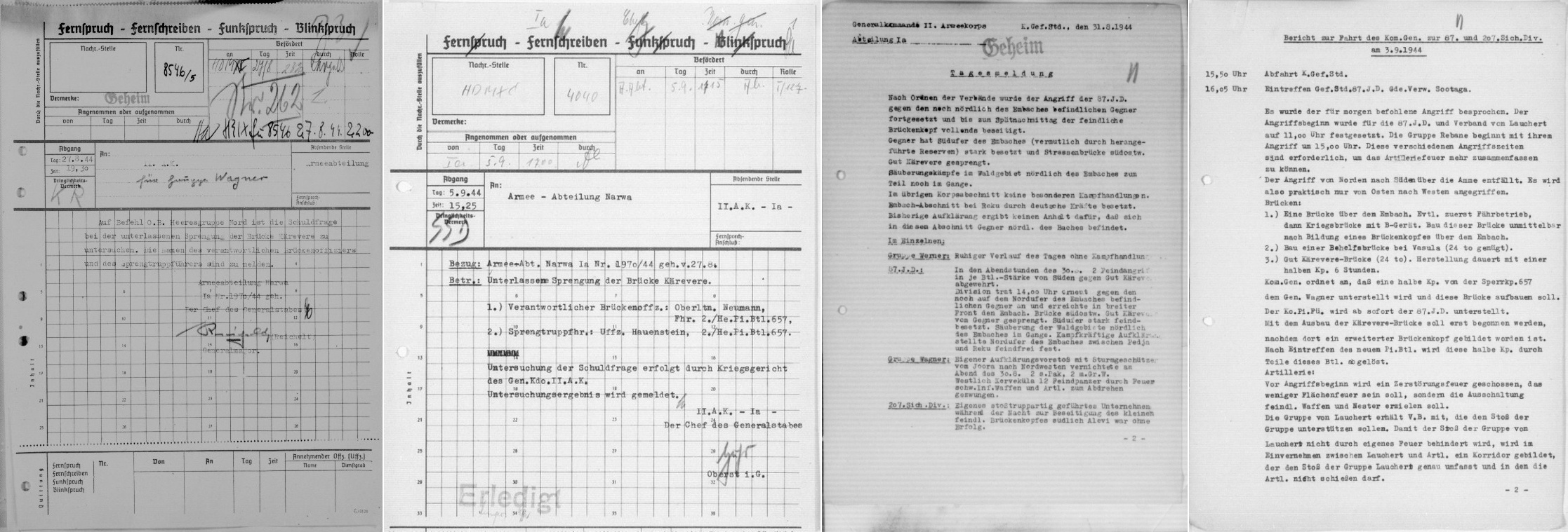 Mjr. Baumgart (AA Narva staap Id) teatab, et Kärevere silla on ületanud 10 nõukogude tanki ilma, et silda oleks õhitud. Ülemjuhatus nõuab selgitust, miks silda õigeaegselt ei hävitatud. Ob.St.B.Fhr Schaefer juhendatud vajaliku uurimisega viivitamatult alustama ja aruannet koostama. (Seda uurimisaruannet kahjuks edaspidi ei mainita kordagi.)