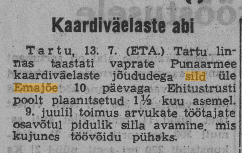 idee tuli mul sellest,et märkasin 1945 aasta Postimehes artiklit silla taastamise kohta Tartus -10 päevaga.
