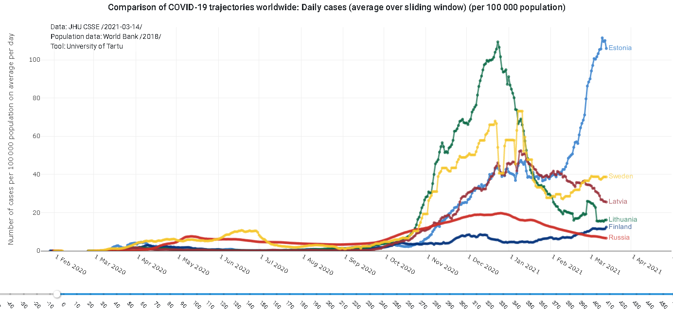 Tartu Ülikooli teadlaste tööriista järgi on Eestil nokk allapoole aga haiglate koormus hakkab vähenema paar nädalat peale nakatumiste vähenemist https://biit.cs.ut.ee/covid/?/#/trajectories