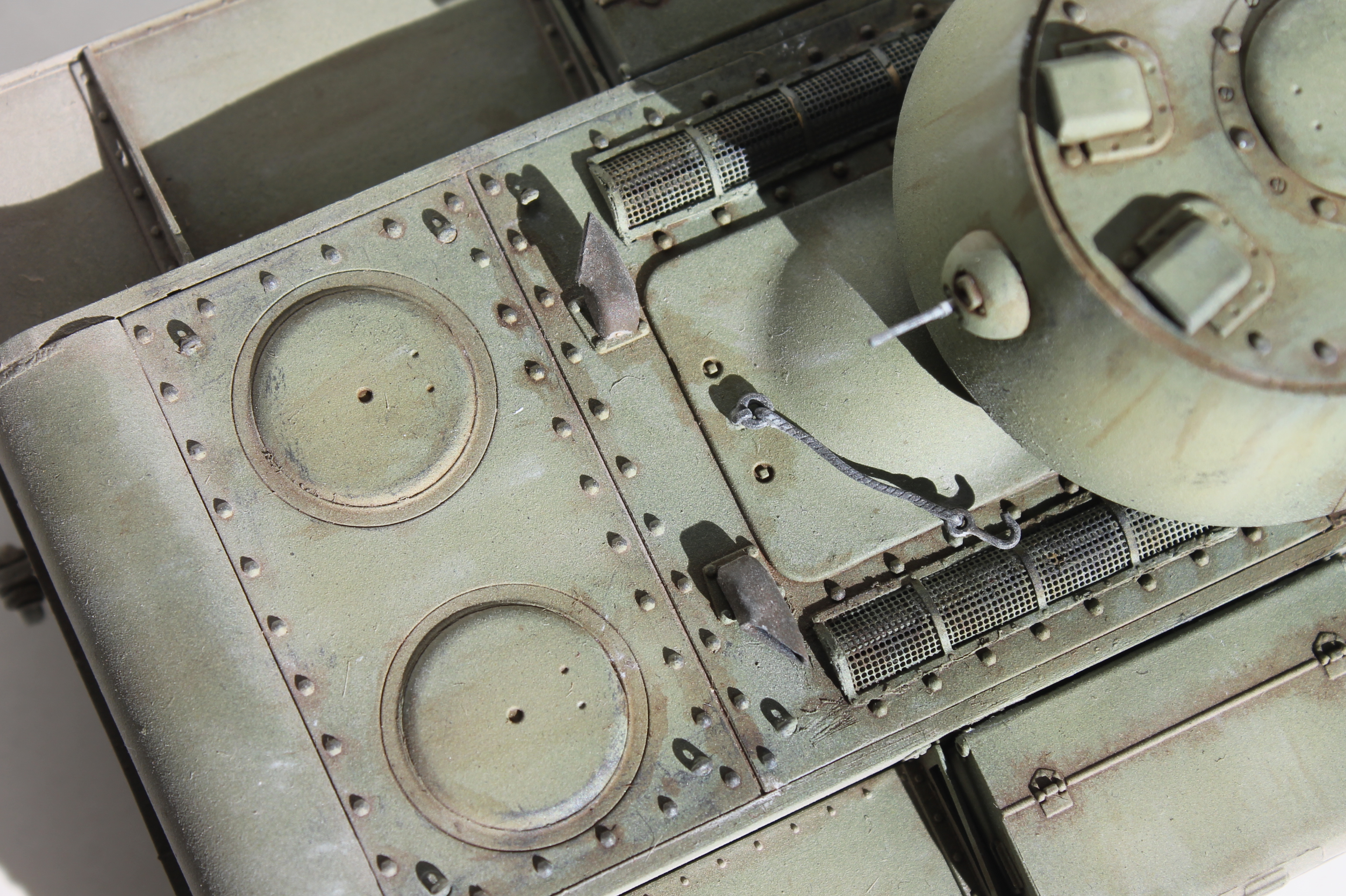 Torni juures saab olema rohkem tegemist - külgedelt poldipead maha ja kumera peaga needid asemele, lae pealt samuti poldid maha ja need kohad siledaks. Samuti luugi ääriku poldid ja nende asemele kruvipead. Siis periskoopide katete ümbert äärikud ära lõigata - neid alguses ei olnud. Sihiku ja laadija pööratava periskoobi ümber kujndatud ringid tuleb täis pahteldada, aga nii, et kruvipead alles jäävad. Ventilaatori äärik tuleb samuti elimineerida, seda lihtsalt ei olnud. Ja nüüd siis kõige keerulisem - ventilaatori kate tuleb õigeks keerata - torni lael paikneb see mingi veidra nurga all. Kui lihtne seda teha saab olema - veel ei tea. Ise arvan, et pärast seda kui olen ventika ümbert krae ära nülginud, siis kloonin ventilaatorit, et oleks pekkimineku korral plaan "b" ikka olemas.