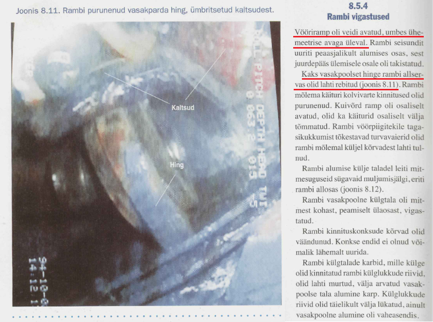 Lõppraporti järgi hoidsid rampi pärast laeva põhja jõudmist ja seal lebama jäädes ees kaks terveks jäänud hinge (s.o. siis "hingekõrvadest" rääkides - kaks hingekõrva laeva kere küljes ja neli hingekõrva rambi küljes). Nüüd "parema parda väike tükk on vöörirambi parema parda hinge küljes" jättis mulle alguses mulje, et ära on rebitud laeva kere küljest, koos väikese tükiga pardast, parempoolse hinge keskmine kõrv, aga 20.juuli OJK pressikonverentsi videot vaadates sai selgeks, et ära on rebitud tükk rambi parempoolsest alumisest nurgast kus asub rambi parempoolne alumine hing ja see rambi tükk on selle parempoolse hinge küljes ja hing omakorda on ilusasti laeva kere küljes. Ehk, et järgi pole andnud mitte hing ega laevakere vaid ramp ise.