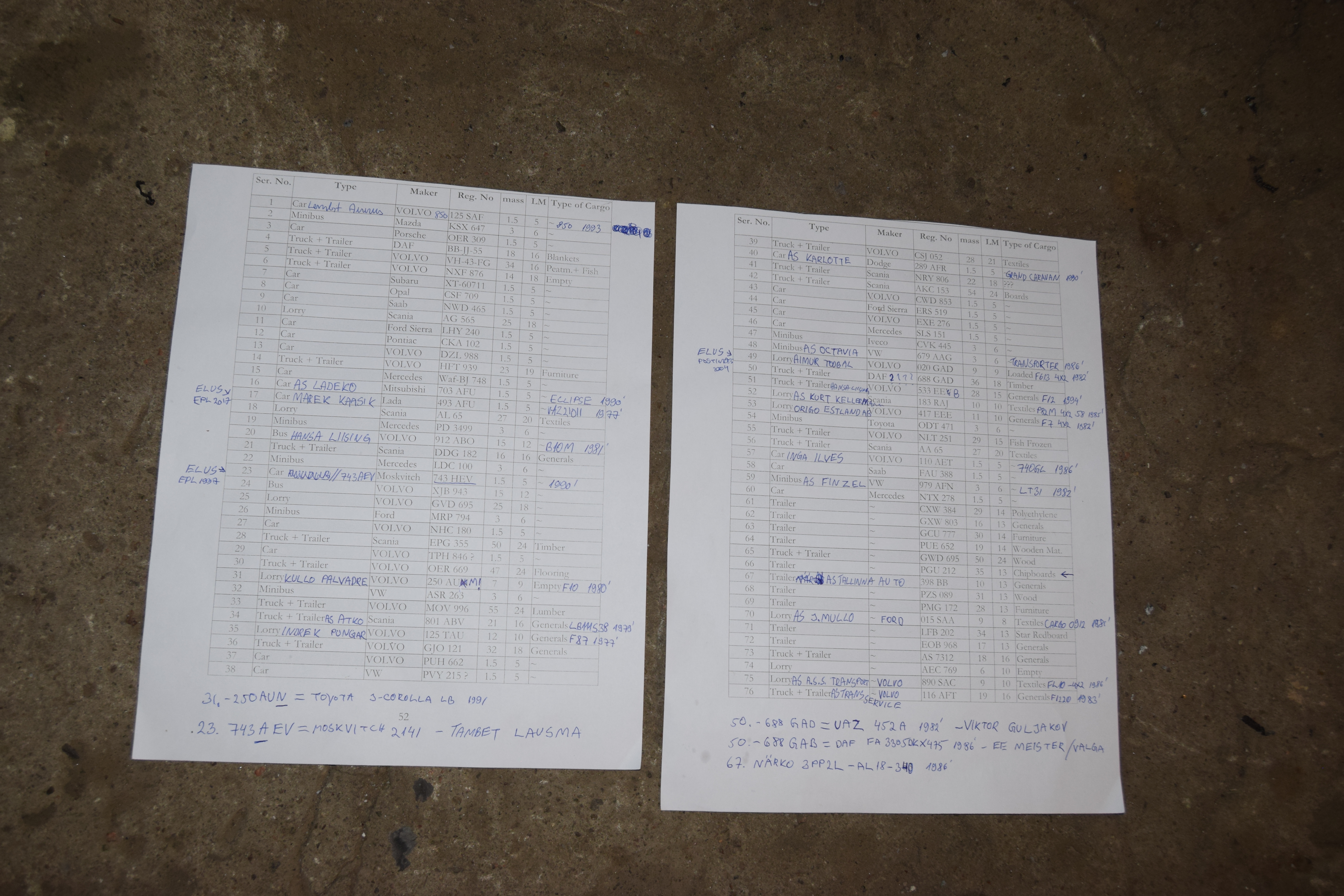 Ime kombel on kolm Eesti autojuhti tanapaevani elus (google). Neilt voiks kindluse mottes ule kusida, kas nagid autotekil mingeid kahtlaseid soidukeid, kuid voimalik et sel pole motet, sest keskmine laevareisija ei poora enamasti tahelepanu teistele suvalistele soidukitele, kui pargib autot laeva, et minna kiiresti edasi reisidekkidele, seda enam et enamasti jalgitakse laevapersonali juhiseid millisesse kohta parkida ja kuidas. Aga paha ei teeks neilt kolmelt ule kusida, niikaua kuniks see on voimalik.