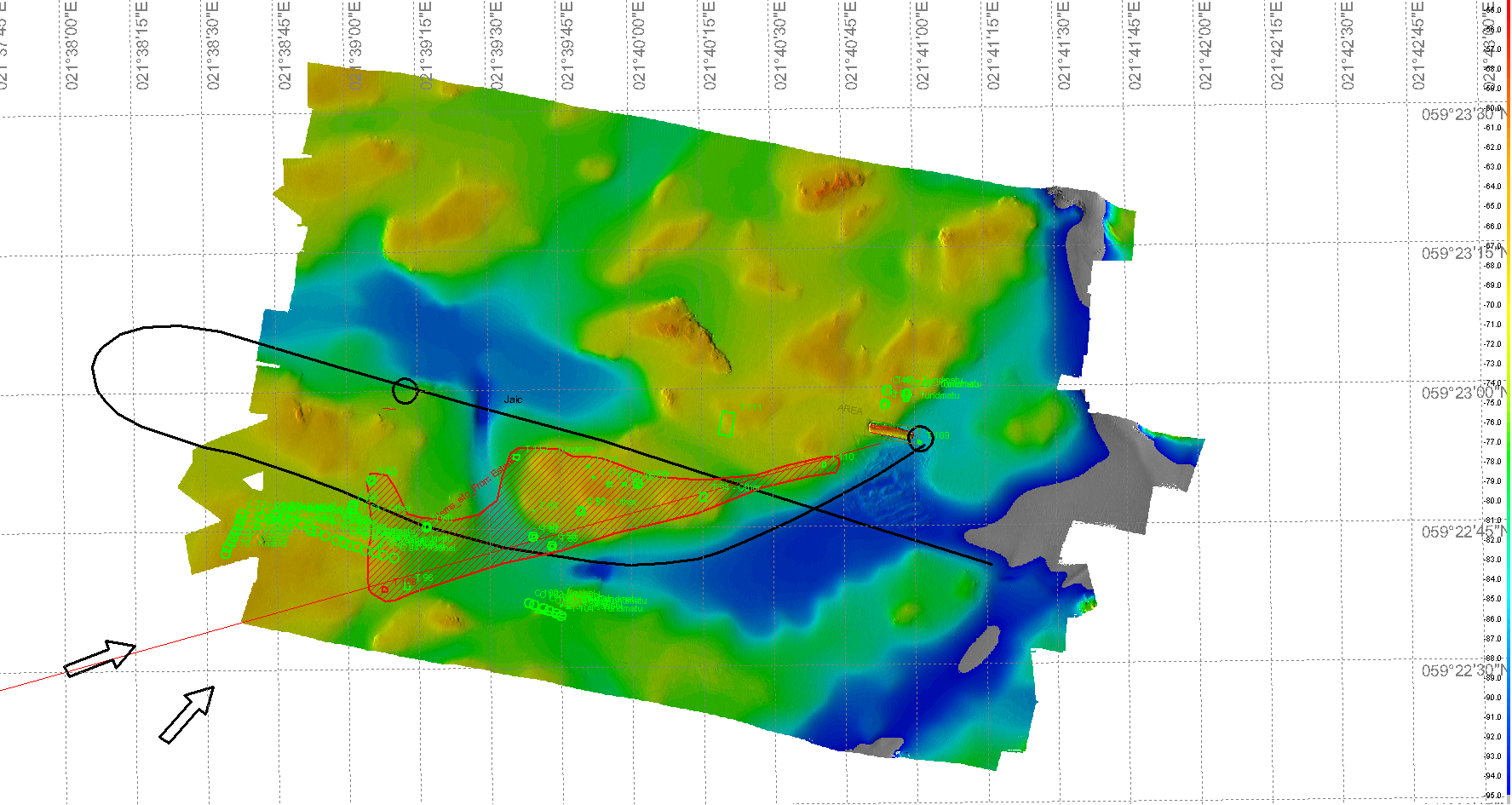 Fucs kirjutas:Siia vahepeal postitatud (oli vist akf BenJunior poolt?) ilma kommentaarideta värviline pilt, mis nüüdseks siit teemast kadunud on, oli sonaripilt laevavrakist ja selle ümbrusest. Pildil oli kujutatud joonega "Estonia" teekond veidi enne õnnetust ja laeva triivimise teekond n.ö. "tagasi" ja risti üle laeva teekonna enne õnnetust.