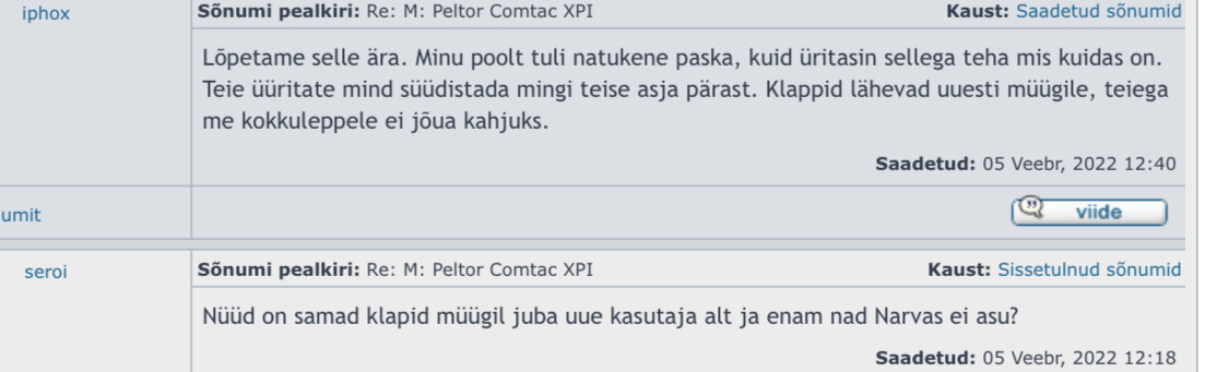 Pehmelt öeldes on tegemist kahtlase olukorraga. Kontakteerusin ma kasutajaga iphox, pakkusin hinda ja küsisin saatmise võimaluse ja asukoha kohta. Sain teada, et saab saata pakiautomaati ja klapid asuvad Pärnus. Kuna ma ise ka Pärnus, siis pakkusin, et pole vaja saata, saame kokku ja teeme kaupa. Selgus, et müüja Soomes ja abikaasa saaks saata klapid ja tehku ma ülekanne abikaasa kontole. Pakkusin, et võin ka abikaasa käest vastu võtta ja poleks ikka vaja saata. Selgus, et klapid ikkagi pole Pärnus ja abikaasa ka mitte ja enne kolme nädalat ei saabu. Küsin kus siis klapid ja abikaasa asuvad. Selgus, et Narvas (üllatuslikult kõige kaugemas kohas Pärnust). Tehku ma ikka ülekanne ja abikaasa paneb teele. Pakkusin, et saan saata tuttava Narva järele. Sobis, aga tehku ma ikkagi ülekanne enne ära. Pakkusin, et malsaks kohapeal sulas ja saabuks esmaspäeval Narva. Eile see sobis, täna aga sama müüja müüb samu klappe uue nime alt ja mulle vastas sõnumiga, et kuna ma teda milleski olin süüdistanud (kusjuures ma polnud sõnumites mitte ühtegi süüdistust ega kahtlust esitanud), siis lähevad klapid uuesti müüki ja mulle ta neid ei müü. Kas pole mitte imelik?