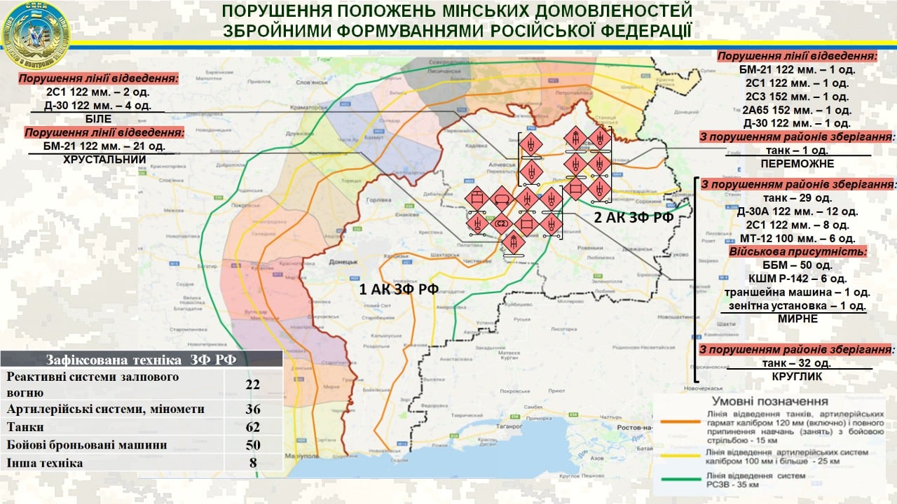 Nii registreeriti missioonil 22 mitmikraketiheitjate ja 10 haubitsat, osa neist Pobednoe asula lähistel lennuväljal, mis asub Luganskist 19 km lõuna pool. Relvastus paigutati puhvertsooni relvakeeldu rikkudes.