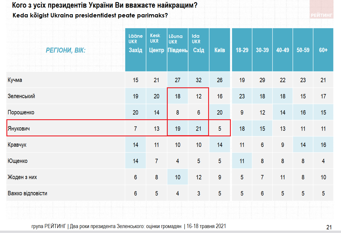 Ma ei tea, kust pärinevad 08.01.2022 artiklis toodud andmed selle kohta, et Janukovitši usaldusväärsus ületab kaks korda Porošenkot ja paar protsenti Zelenskit, aga ilmselt on see välja rebitud siit tabelist, lõuna ja ida UKR regioonide lahtritest (2021a mai UKR enda küsitluse tulemused):